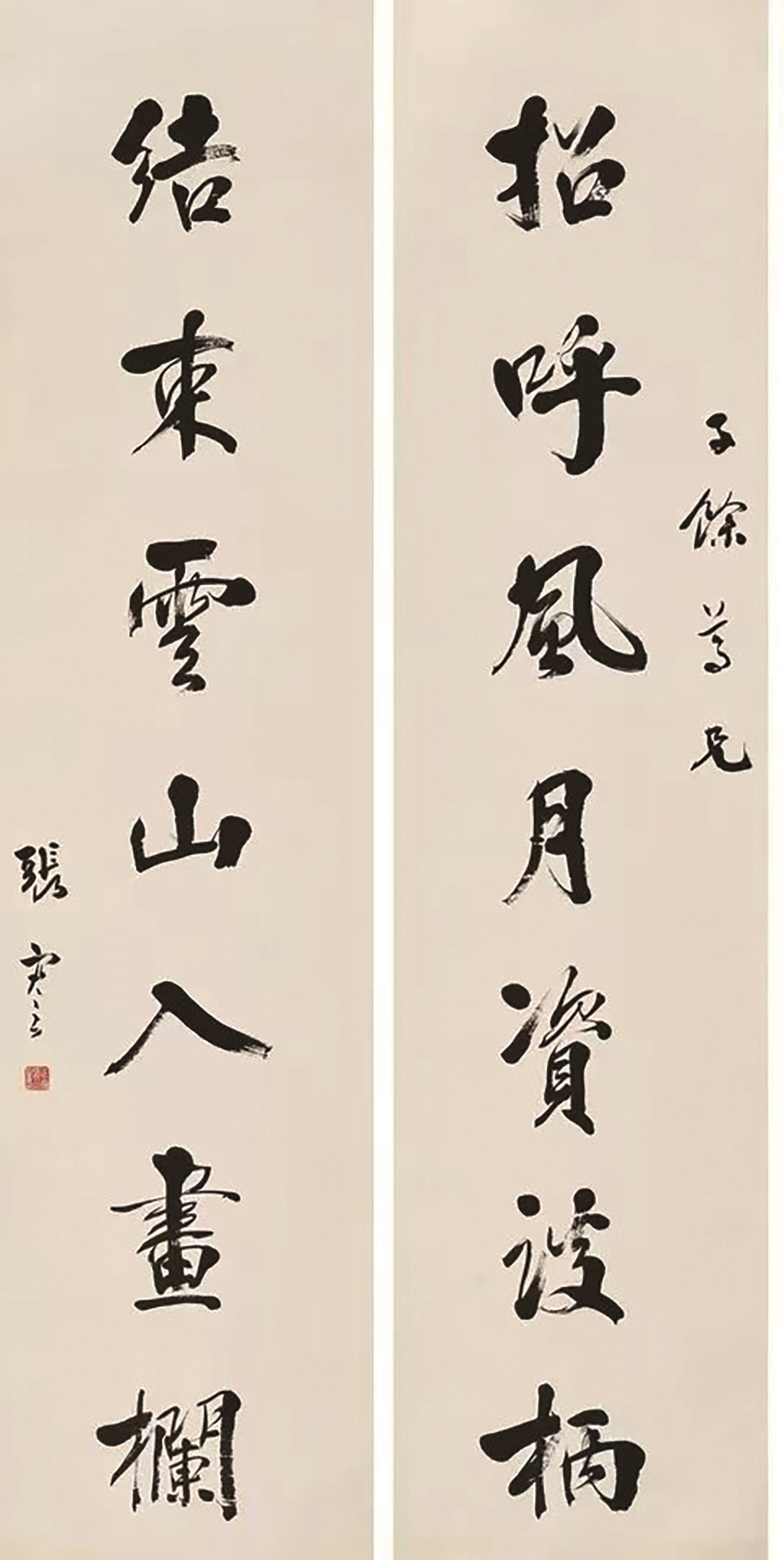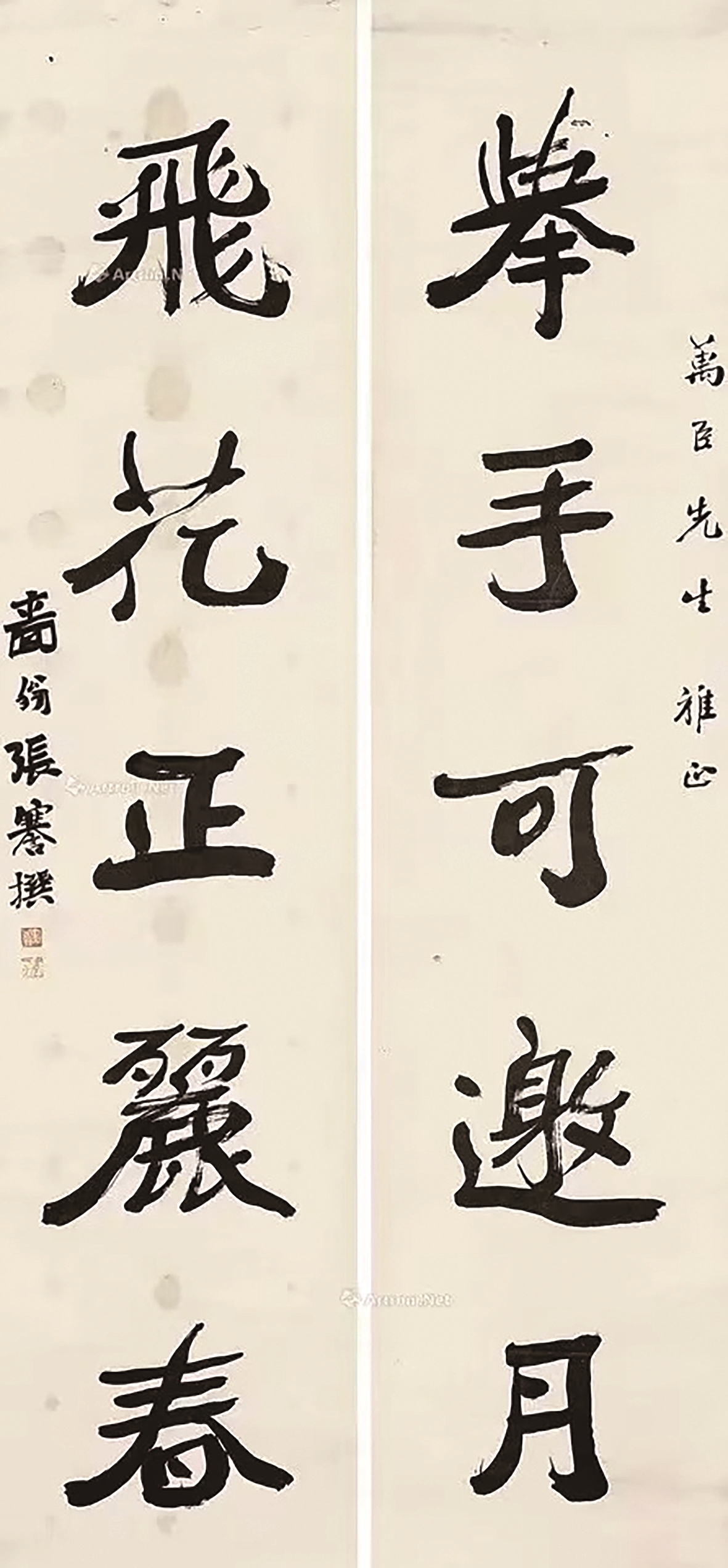 “举手可邀月,飞花正丽春。” 此联款识为:“万臣先生雅正,啬翁张謇撰。” “撰”表明:张謇不是抄录、不是集句,而是原创。李白《登太白峰》:“西上太白峰,夕阳穷登攀。太白与我语,为我开天关……举手可近月,前行若无山。”诗人以“举手可近月”,极写出太白峰的高峻。李白还有诗句:“俱怀逸兴壮思飞,欲上青天揽明月。”(《宣州谢朓楼饯别校书叔云》)。登上谢朓楼,诗人神思飞越,想乘风归去、揽月入怀,其飞动健举的形象,体现了豪迈的意气。张謇“举手可邀月”同样有一股豪迈之气。下联“飞花正丽春”,“丽”宜作使动理解。飞花使春天更美丽, 赞赏花,透露的是自信。张謇撰写此联时未必在赏月,但是,如此豪迈自信,应该是在人生的高光时刻。
