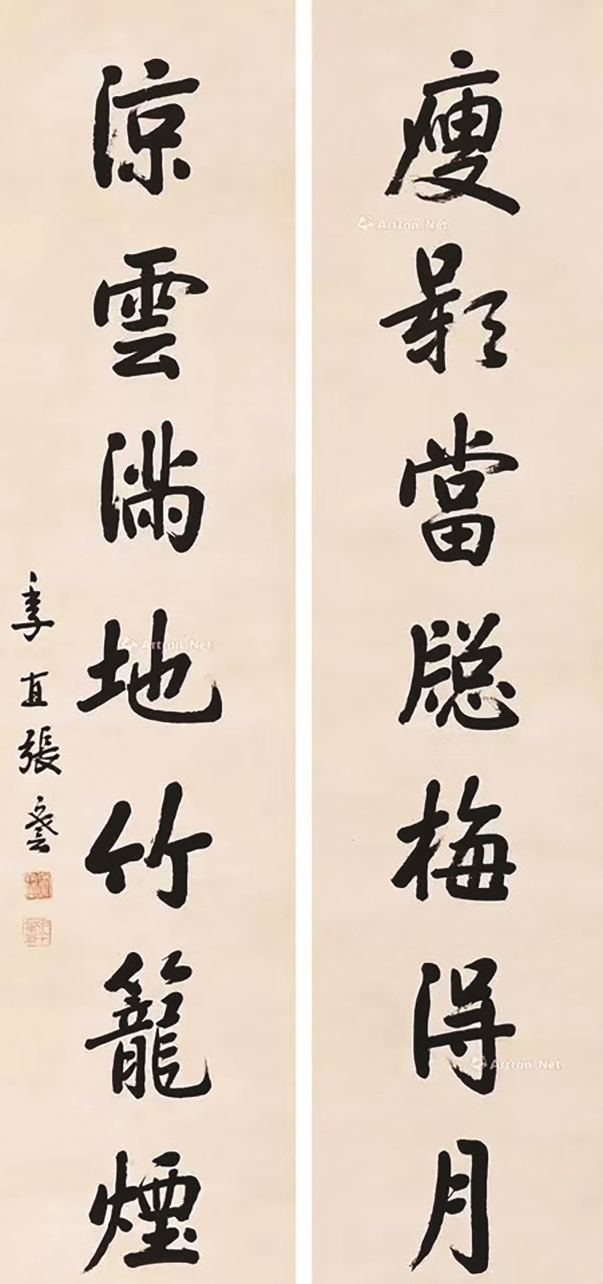 “瘦影在窗梅得月,凉云满地竹笼烟。”款识为“季直张謇”和两方印章。此联系诗词摘句,摘自宋代米芾的《无题》。张謇写给何人、写于何时,信息均缺失。不过,这并不影响我们欣赏此联。“瘦影在窗梅得月”,描绘了一幅月光下梅花孤傲独立的画面,梅花的瘦影映照在窗户上,仿佛是月光与自然的交响乐章,展现出一种高洁与孤独并存的意境。“凉云满地竹笼烟”,则进一步渲染了环境的清凉与幽静,凉爽的云雾弥漫在大地之上,竹林间似乎笼罩着一层轻烟,营造出一种超脱尘世的氛围。作者以梅、月、云、竹等自然元素为载体,传达出一种超然物外的情怀和对自然之美的深刻感悟,其中,梅的出现,表明此联中的“月”不是中秋月,而是冬日夜晚的月。