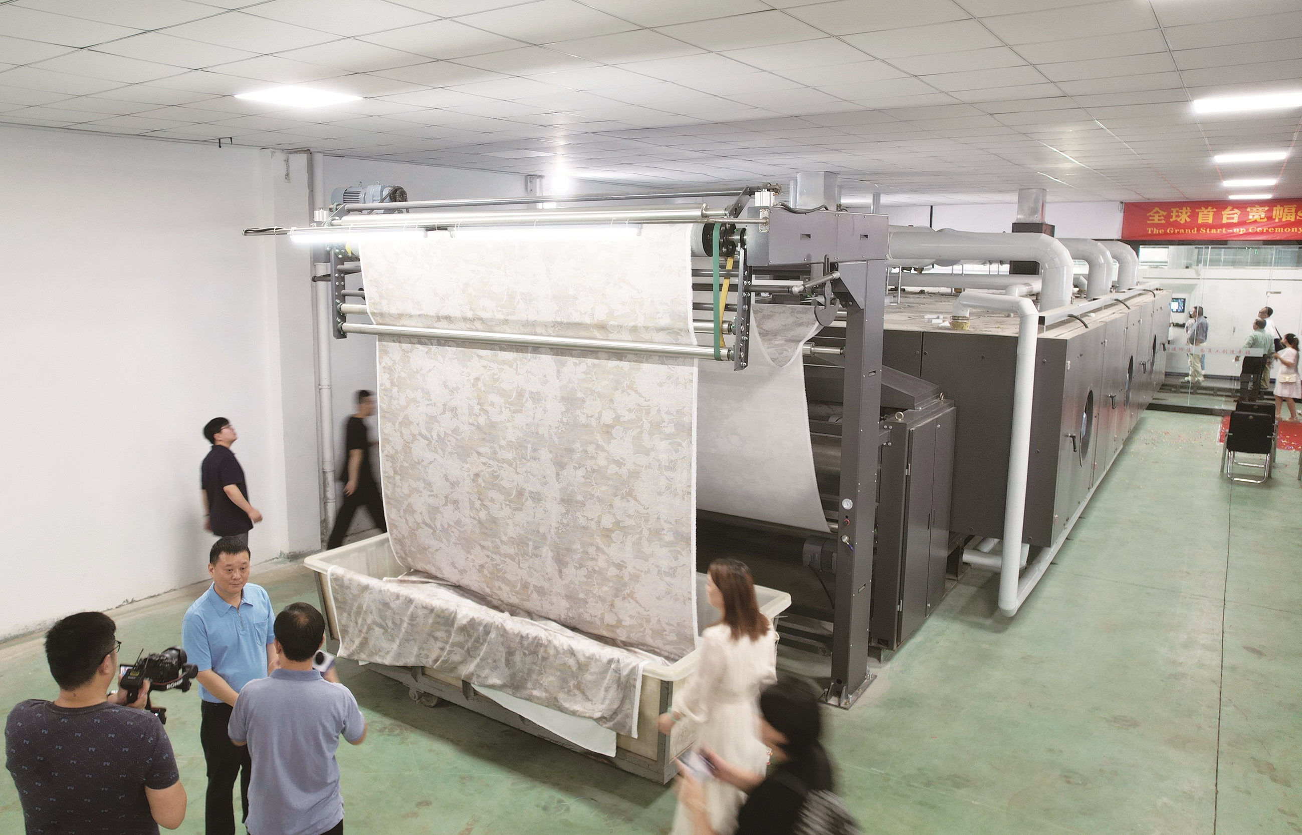 20日,在位于通州区先锋街道的江苏州际数码印花有限公司的厂区内,一台宽度超过3米、长度超过50米的数码印花“巨无霸”正式开机投入使用。据了解,这台印花机装有336个喷头,每天可印花布9万多米,实现上百种套色,印出的花型几乎可以达到裸眼3D的效果。 记者 许丛军摄