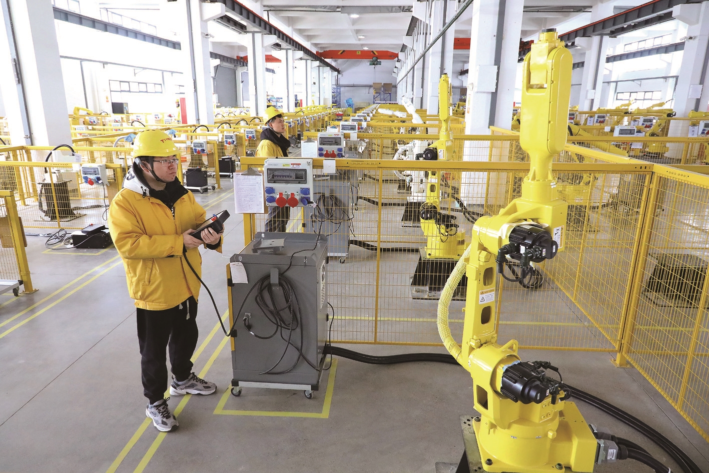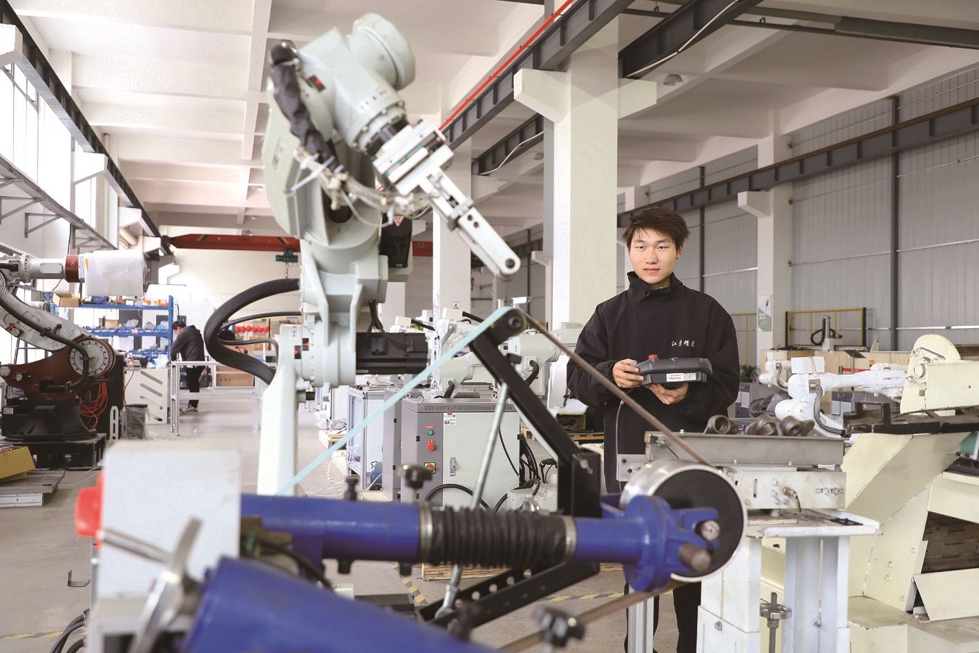 江苏图灵智能机器人有限公司技术工作人员正在完成智能机械臂交付调试,助力多家企业智能自动化生产线建设。 濮端建摄