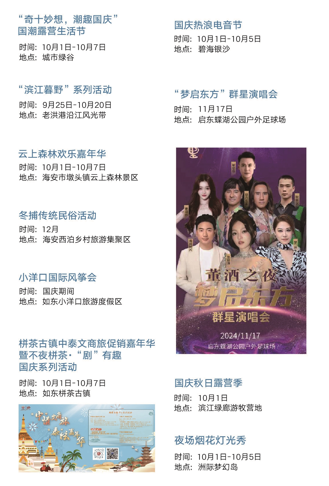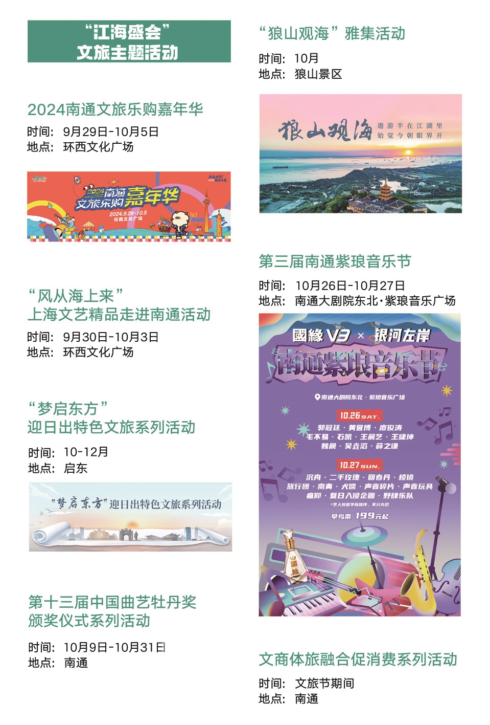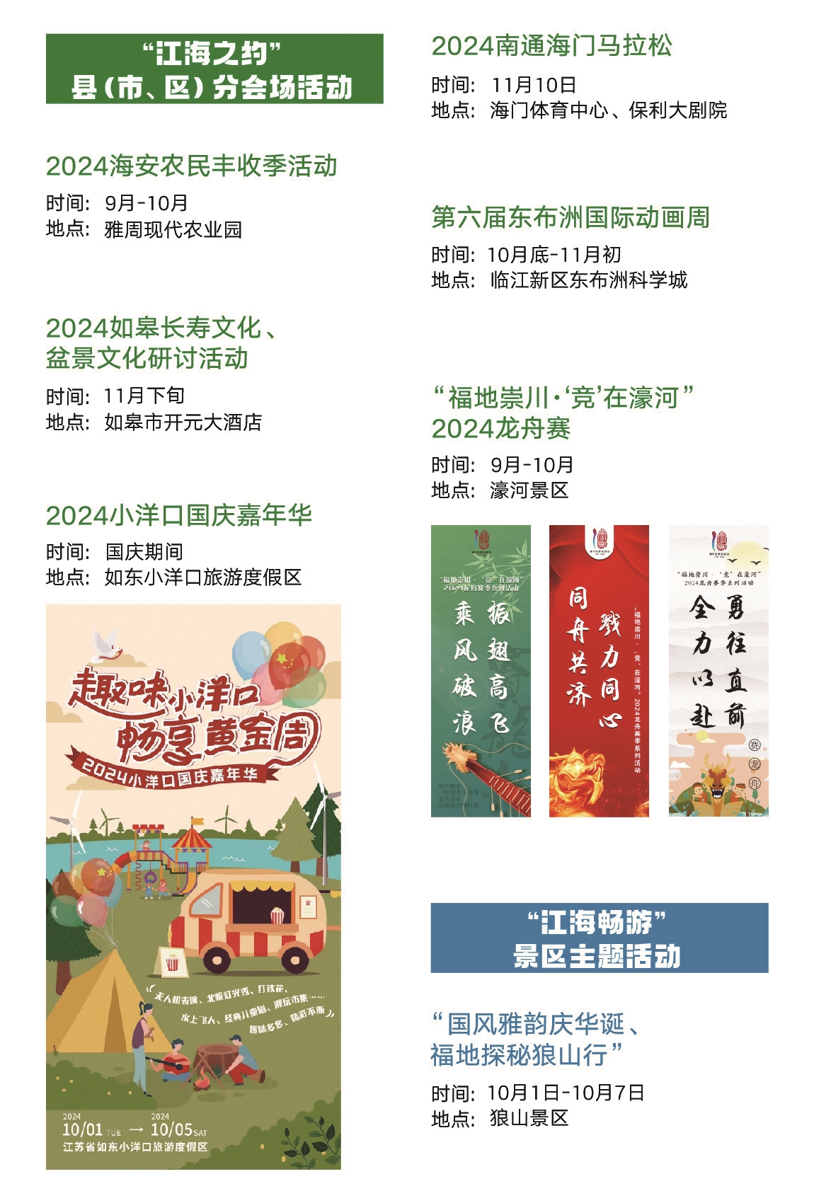 ■江海之约 今年9—12月份,各县(市、区)还将举办包含海安农民丰收季活动,如皋长寿文化研讨活动,如东小洋口国庆嘉年华,海门第六届东布洲国际动画周,苏锡通园区第二十届“江海风韵”文艺汇演等精彩纷呈的分会场活动10项。