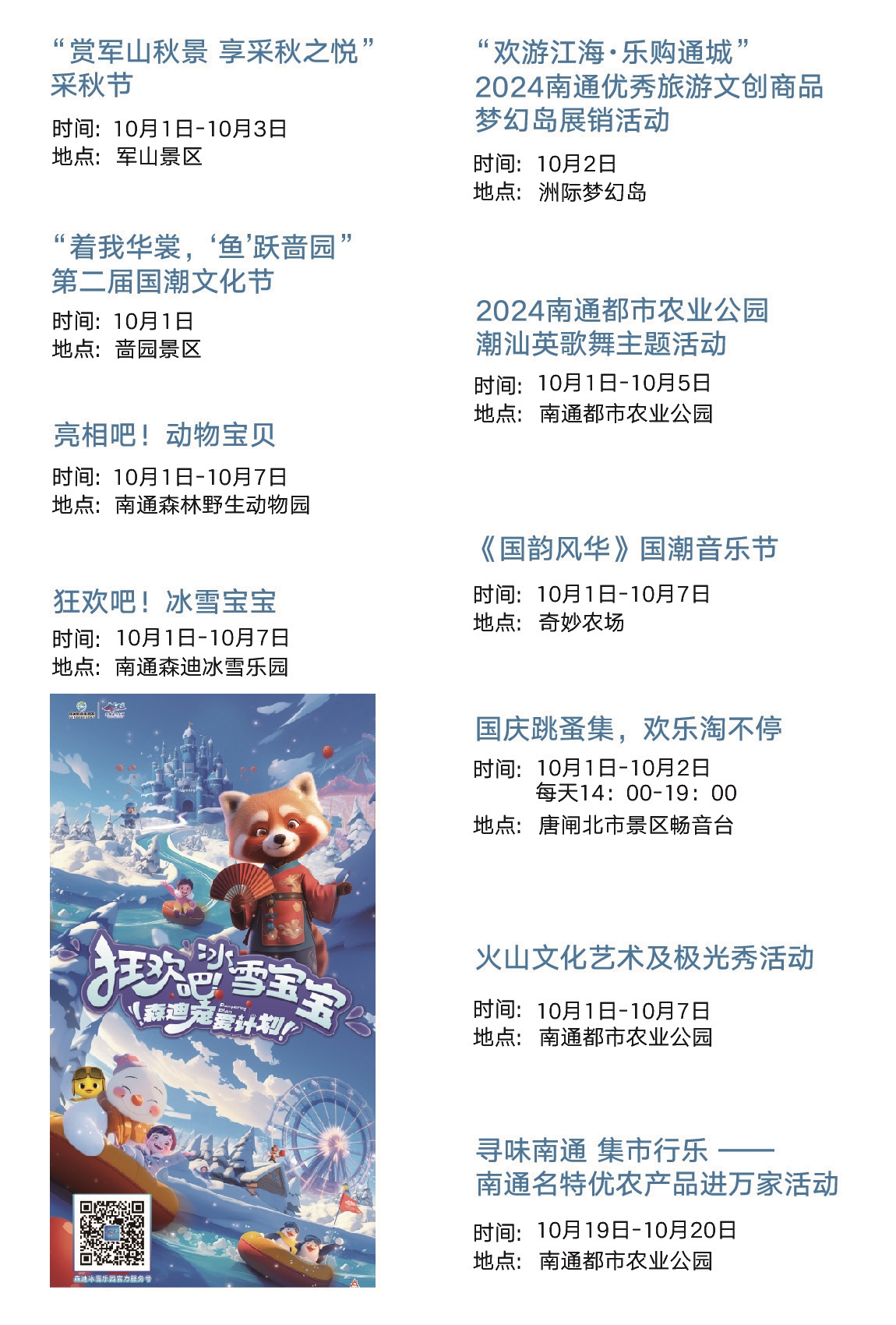 ■江海畅游 文旅节期间,全市各大景区景点推出金秋游狼山活动、森林野生动物园“亮相吧!动物宝贝”、森迪冰雪乐园“狂欢吧!冰雪宝宝”、城市绿谷“奇十妙想,潮趣国庆”国潮露营生活季、栟茶古镇文商旅乐购嘉年华、碧海银沙国庆热浪电音、鲜花小镇金秋“趣”野嘉年华等游玩主题活动30项。