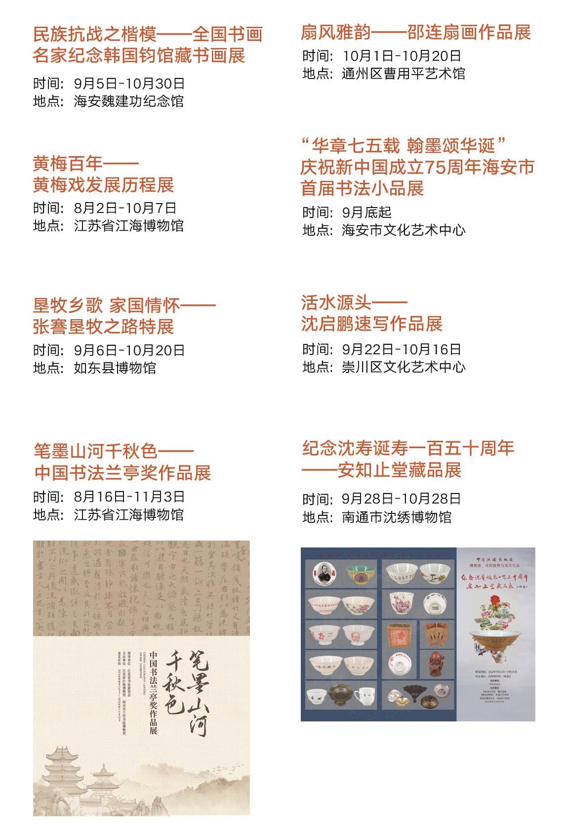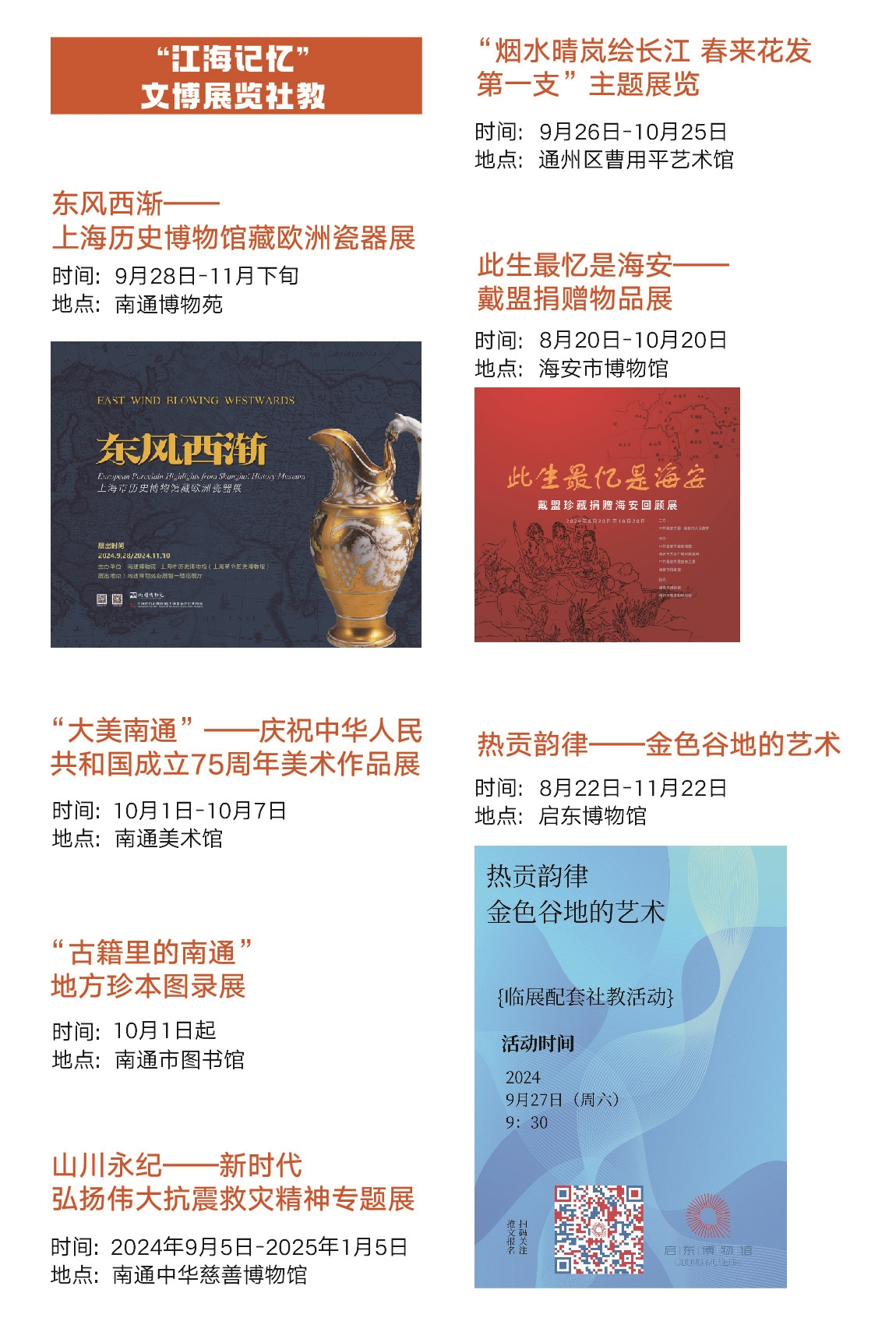 ■江海记忆 文旅节期间,全市还将举办东风西渐——上海历史博物馆藏欧洲瓷器展、家乡情怀——国家非遗如皋丝毯展览、纪念沈寿诞寿一百五十周年——安知止堂藏品展、山川永纪——新时代弘扬伟大抗震救灾精神专题展、镂月裁云——民间剪纸艺术展等32场文博展览和社教活动。