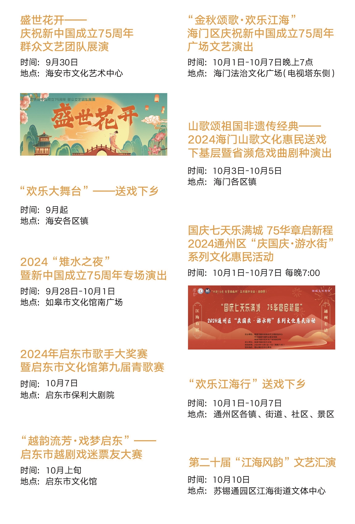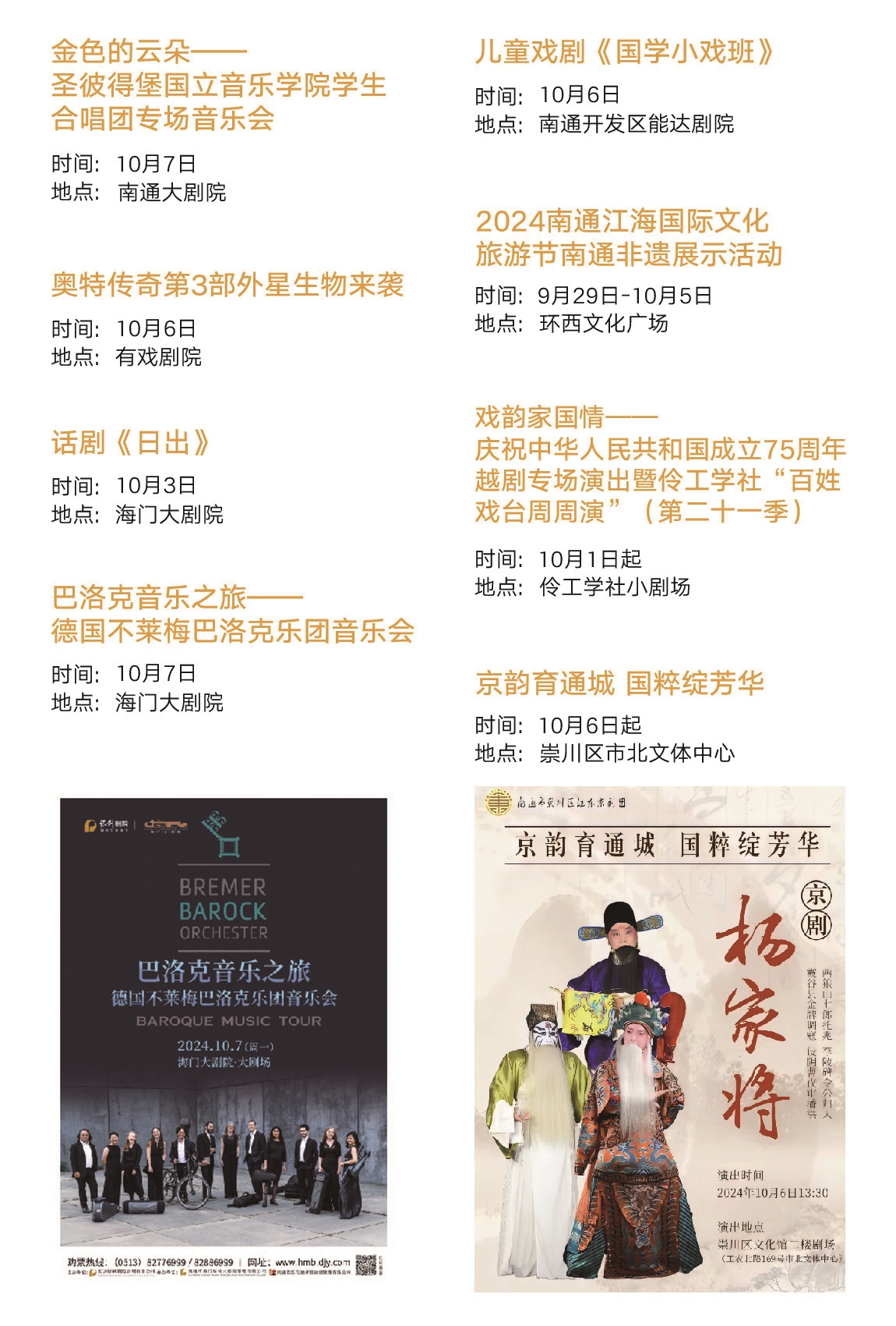 ■江海雅韵 为丰富市民的文化生活,全市国有文艺院团将组织举办音乐剧《杨戬》、话剧《日出》、苏州民乐团音乐会《征程·光明》、“乐享丰收 喜迎国庆”江苏如东洋口村晚系列活动、2024“水街19点 乐享南通州”艺术展示活动之“国庆七天乐”系列活动等文艺演出50余场。