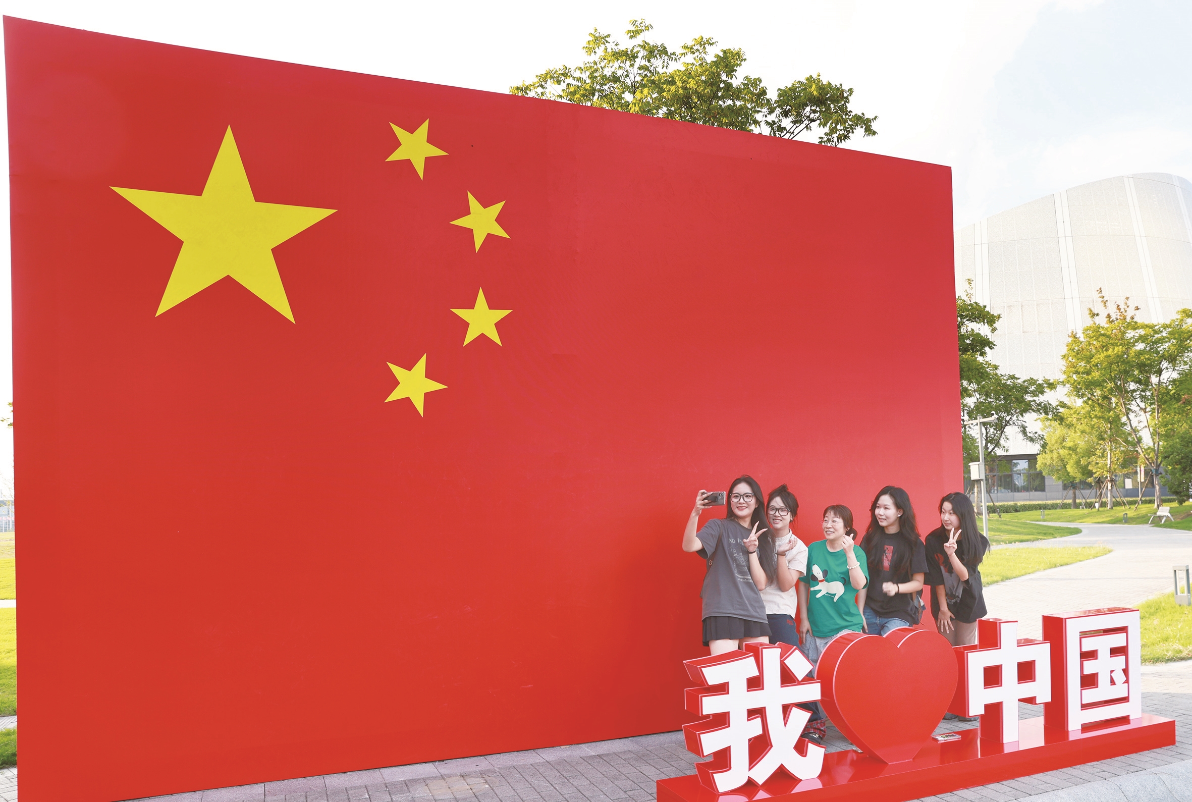 昨天,在南通美术馆参观书画、摄影作品展的南通大学艺术学院师生在巨幅国旗前留影。为庆祝中华人民共和国成立75周年,崇川区设置了多处国庆节主题景观,营造喜庆的节日氛围,表达对祖国的美好祝福。 记者 许丛军摄