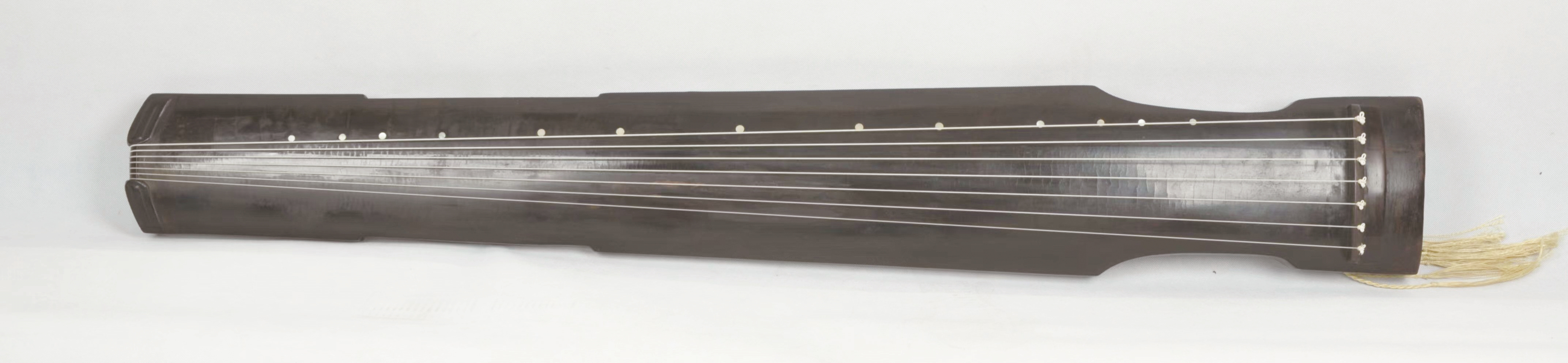 第二床为仲尼式“一天秋”琴,通长120.5厘米,隐间112.3厘米,肩宽19.8厘米,尾宽13.4厘米。面桐底梓,黑漆,底面呈细牛毛断。腰部微收,造型精秀。琴额原刻“一天秋”三字,因漆补已漫漶。腹内烙“朱致远制”四字。