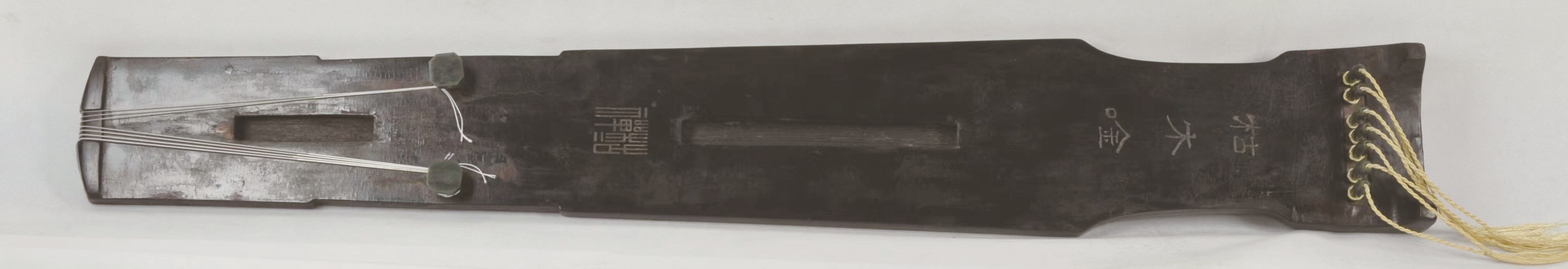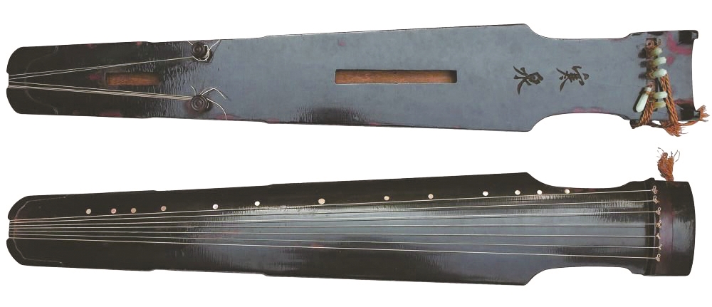 第一床为仲尼式“寒泉”琴,长122.5厘米,隐间112.5厘米,肩宽19.5厘米,尾宽12.8厘米。髹黑漆,间有朱砂。琴面以小蛇腹断、小流水断为主,局部有梅花断。长方池沼,龙池上方刻琴名“寒泉”。腹内墨书分别为龙池右侧“乾道四年紫阳朱氏藏”,龙池左侧“光绪十二年云闲重修”,凤沼右侧“蠙山琴士韵泉顾氏监修”。顾韵泉,名沂,为云闲好友。他是如皋蠙山人(今属如东),擅古琴制作与修复,斫有落霞式“霜天铎”琴传世。