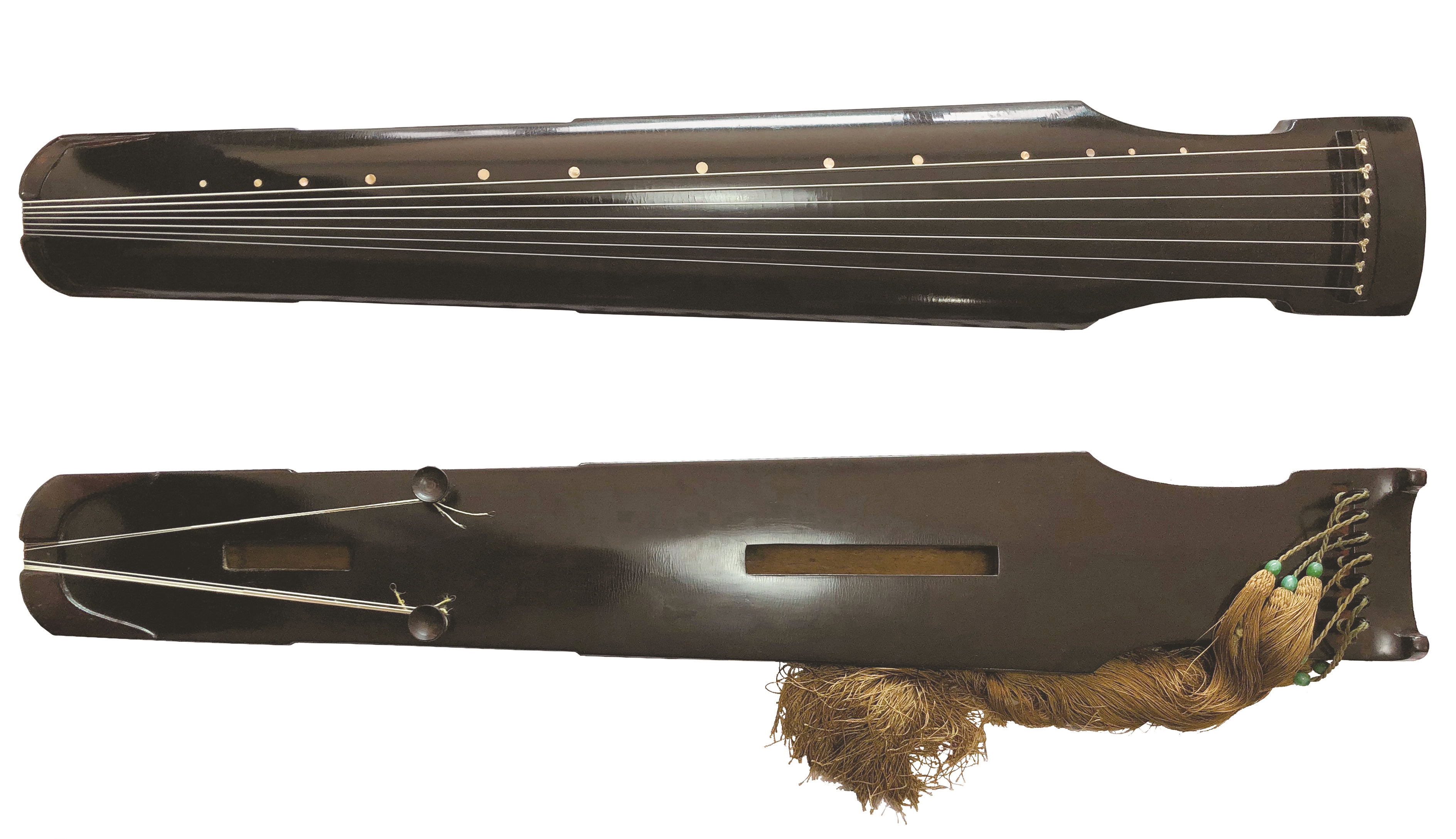 第三床是仲尼式“枯木吟”琴,通长120.5厘米,隐间112.2厘米,肩宽17.9厘米,尾宽13.1厘米。面桐底梓,黑漆,鹿角灰胎,内杂孔雀石屑,发牛毛断兼小流水断,局部有梅花断。琴尾方纹冠角与琴背一字眉式龈托颇有特色。龙池上方刻琴名“枯木吟”,与云闲自制曲之一同名。龙池下方“枯木禅”方印,与琴谱自序后钤印一致。“枯木吟”的原配琴囊在下部预设两孔,以便雁足露出。