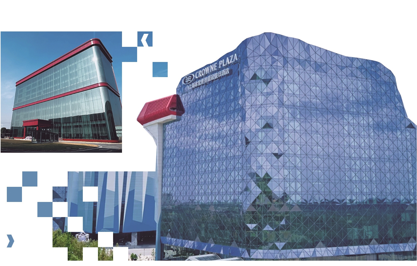 此次上海耀雪冰雪世界的皇冠假日酒店外墙使用的是高性能节能环保玻璃,采用先进的真空磁控溅射镀膜技术,能够降低热量传导,减少温度流失,大大降低夏季空调等制冷设备能耗,实现全年能源节约。这些幕墙玻璃由三角形异形玻璃拼接而成,配置多、要求高,皓晶集团海门基地克服各种困难,共提供了1.1262万片玻璃,约2.6万平方米。