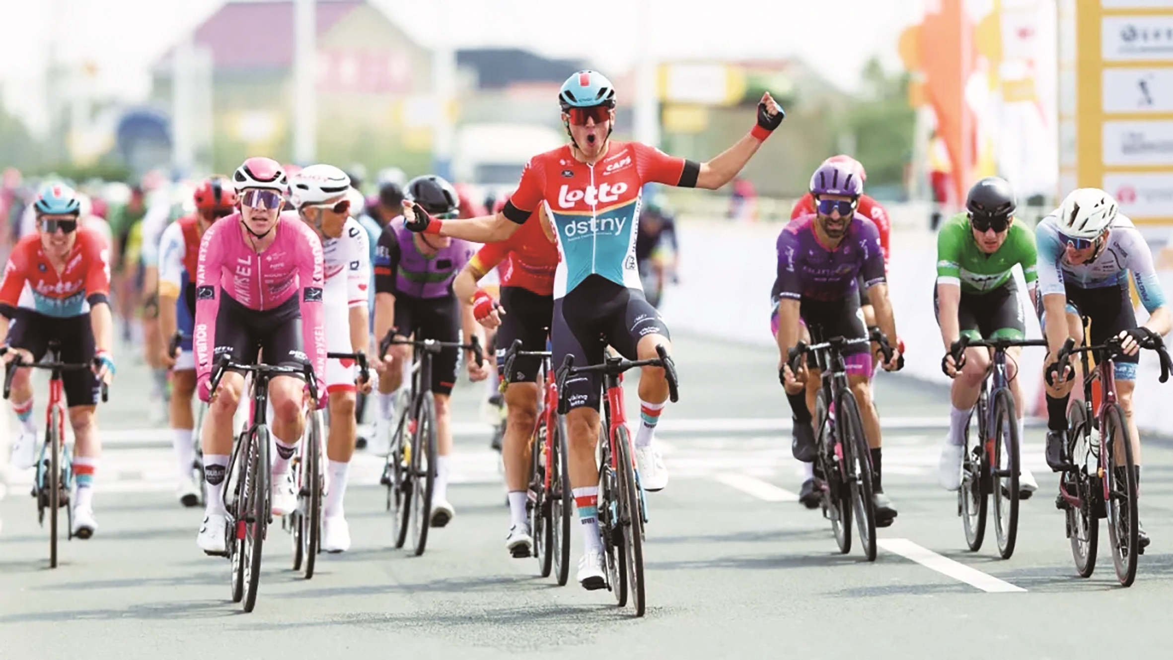 昨天上午,2024第十二届环太湖国际公路自行车赛暨长三角穿越赛启东站(追江赶海环启赛)开赛,来自全球22支顶尖车队、131名职业骑手引燃速度与激情的“高光时刻”。图为比赛时的场景。 黄海文 王海兵摄