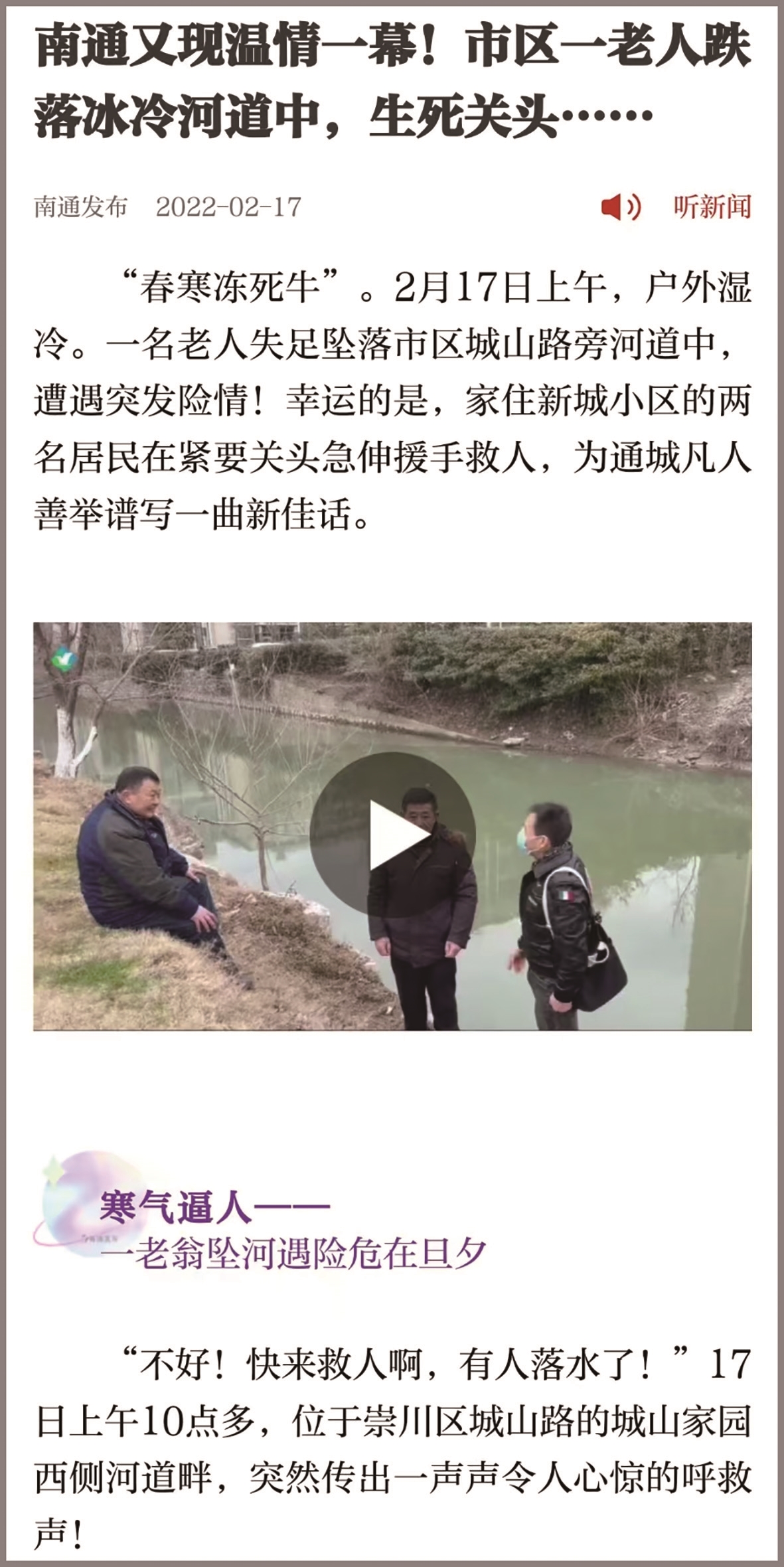 2022年2月,春寒料峭,一名老汉不慎落水,情况危急。幸运的是,正在附近的两位古稀老人先后赶到事发地,并合力救起落水老汉。热心市民将这一幕拍下,并爆料到报社新闻热线,希望通过媒体传递凡人善举的大爱力量。