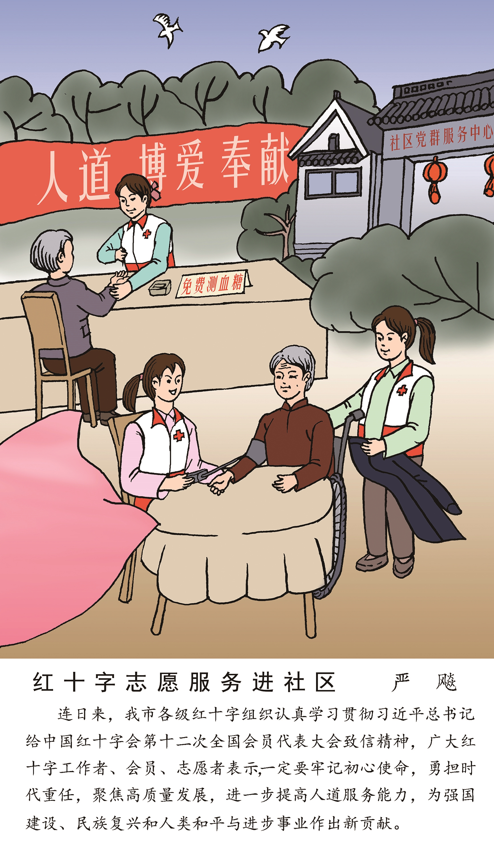 在中国红十字会第十二次全国会员代表大会召开之际,习近平总书记致信大会,向全国广大红十字工作者、会员、志愿者致以诚挚问候,寄以期待与厚望,也让我市各级红十字组织备受鼓舞。日前,红十字志愿服务进社区活动正蓬勃开展。严飚画