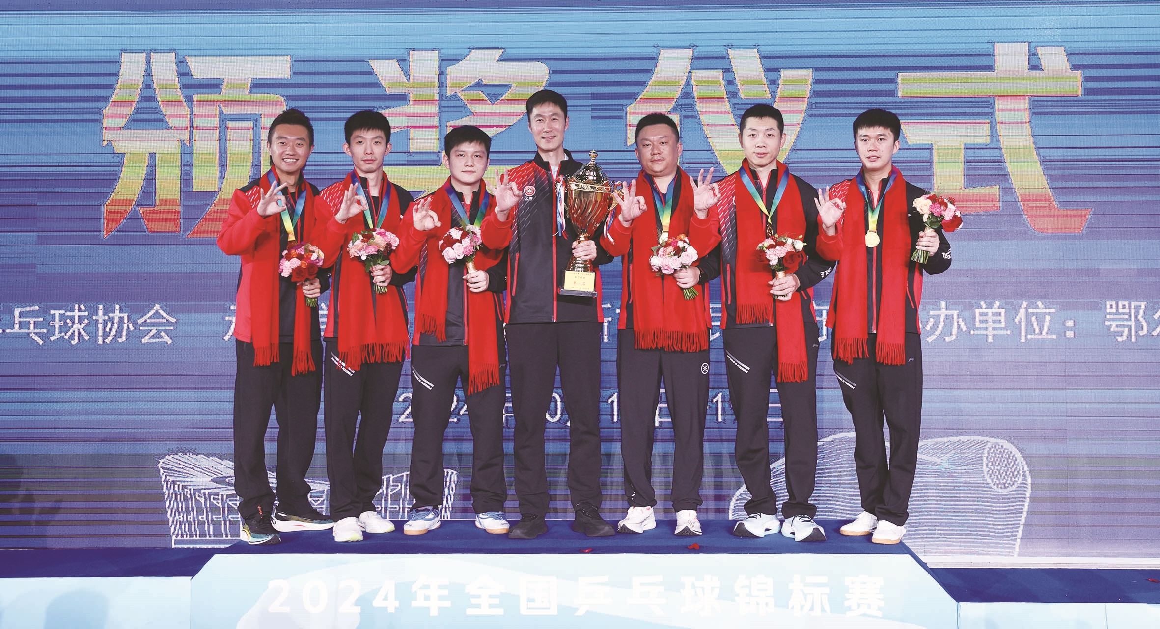 19日,冠军上海地产集团队队员赵子豪、周恺、樊振东、中国乒协副主席、上海市竞技体育训练管理中心主任王励勤、教练张洋、队员许昕、赵钊彦(从左至右)在颁奖仪式后合影。当日,在内蒙古鄂尔多斯举行的2024年全国乒乓球锦标赛男子团体决赛中,上海地产集团队3比1战胜黑龙江银河队,夺得冠军。 新华社照片