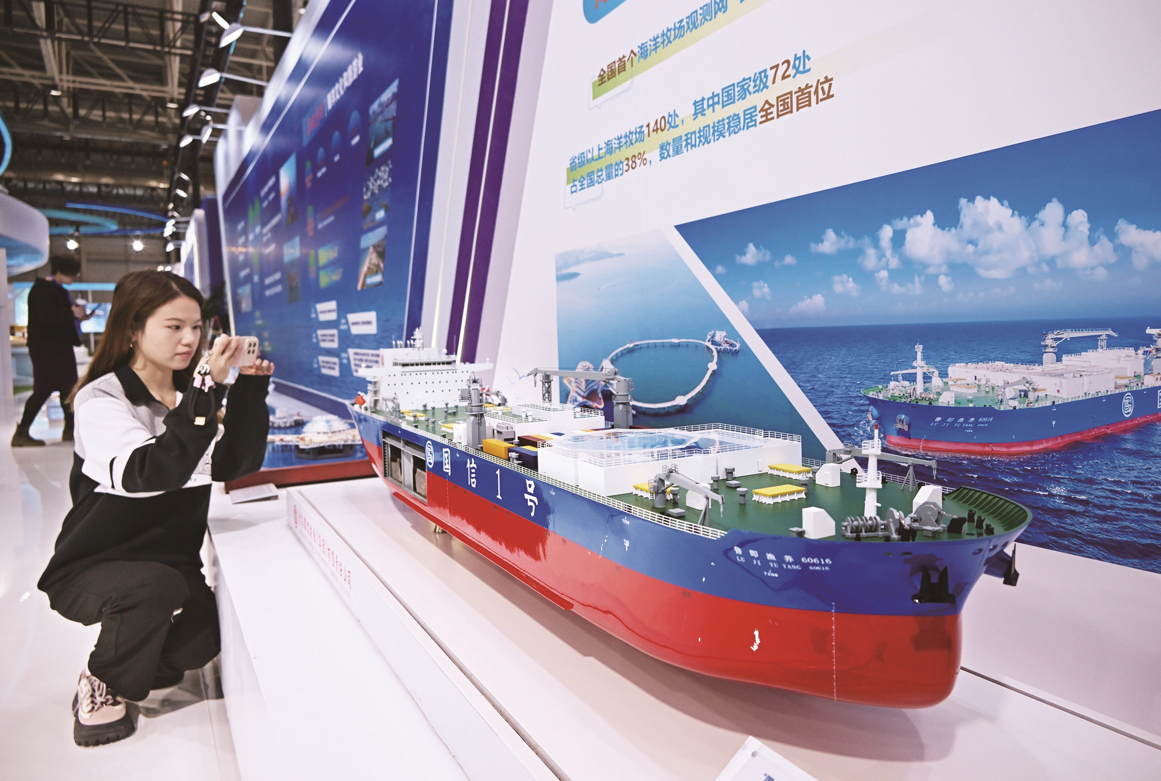 昨日,一名参观者在2024东亚海洋博览会上拍摄养殖工船模型。当天,2024东亚海洋博览会在山东省青岛市开幕。本届展会吸引了国内外500余家相关机构参展。 新华社照片