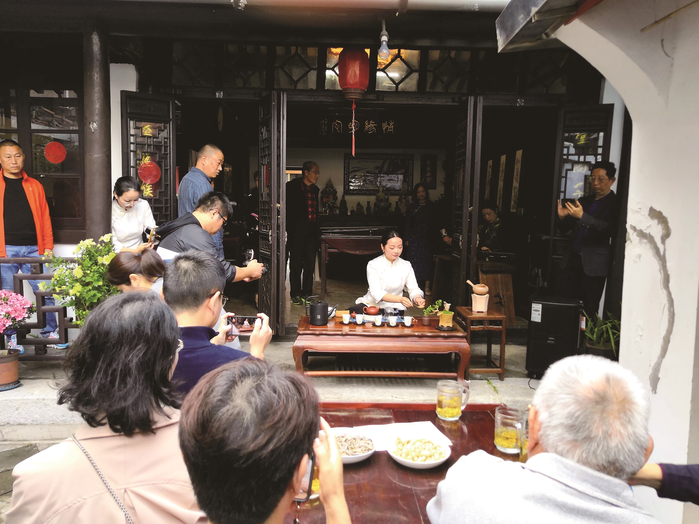 昨天下午,和平桥街办、民盟南通文化支部在西南营文史研究室举办“明宅庭院四季春”听琴绘画品茗雅集活动,众多艺术爱好者相聚在一起,进行茶道表演、书画展示、古琴演奏。 戴秉钧文 张建生摄