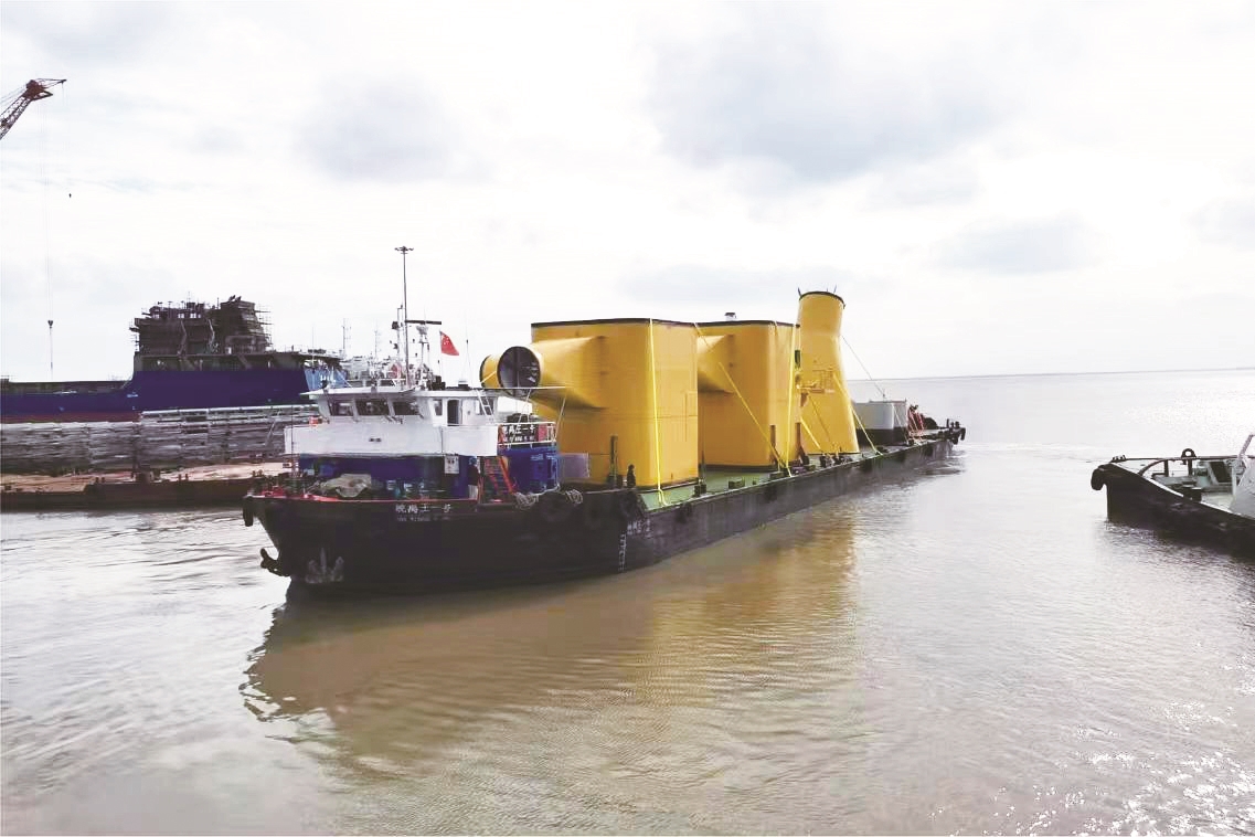 该海上漂浮式风电基础结构项目分两批发货,本次发运的第二批为样机26个总段,里面包含发电机系统、系泊系统、通风系统等。5MW漂浮式海上风电结构样机总长52米,宽52米,风机高度94米,总重约2000吨,整个项目预计将于2025年进行最终调试。