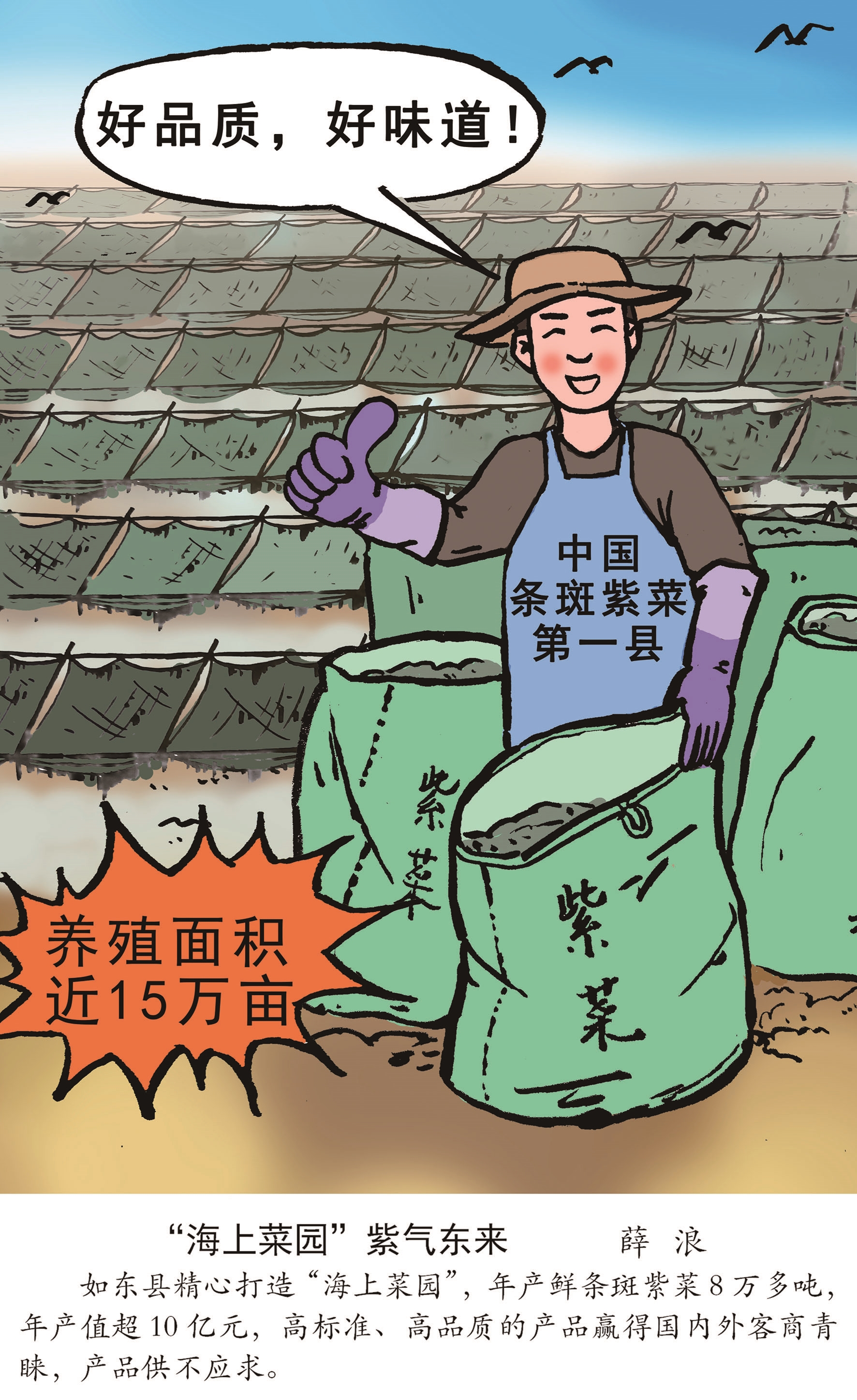 如东县精心打造“海上菜园”,年产鲜条斑紫菜8万多吨,年产值超10亿元,高标准、高品质的产品赢得国内外客商青睐,产品供不应求。薛浪画