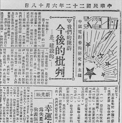 1933年5月,王尘无写了《中国电影之路》一文。他以马克思主义的世界观对中国的经济状况、政治状况、各阶级面貌、电影事业现状进行了科学分析,明确指出当前中国电影的反帝反封建的任务,并提出:“只有建立起中国电影观和电影批评的标准,我们才能更具体的、更有计划的推动促进中国电影”。