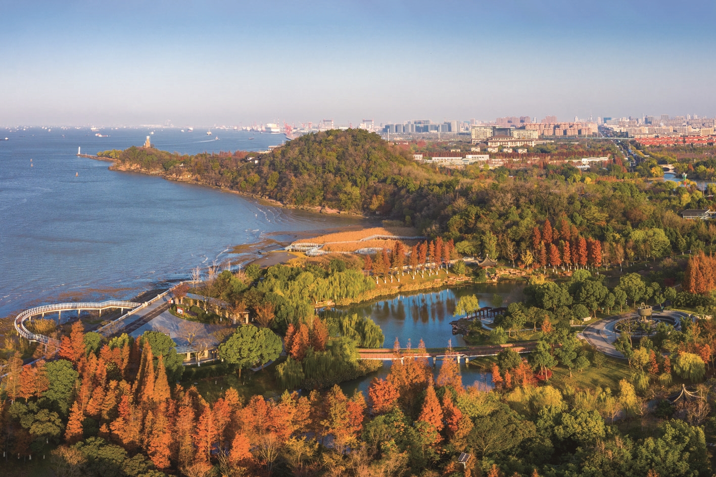 岸边青山如黛,江上万舸竞发,水中鱼类嬉戏。秋末冬初,市民纷纷前往五山地区及沿江地带,赴一场山水之约。森林公园内,狼山、军山、剑山、马鞍山、黄泥山宛如五颗绿色的翡翠镶嵌在扬子江畔,骑行者、徒步者、漫步者,呼吸清新空气,亲吻澄澈天空,拥抱初冬暖阳,享受难得的悠闲慢时光。