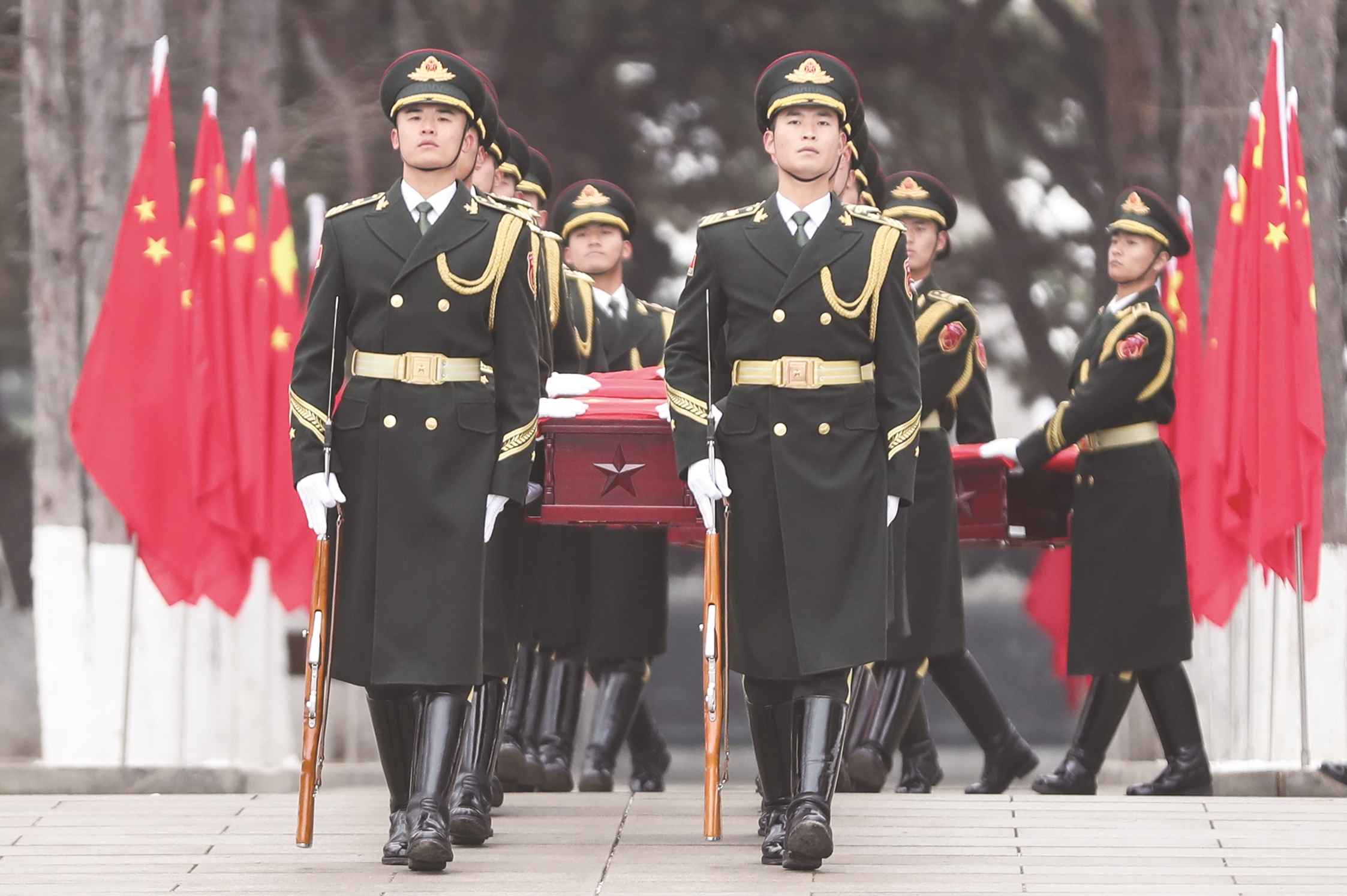 11月29日,礼兵护送志愿军烈士棺椁入场。当天上午,第十一批在韩中国人民志愿军烈士遗骸安葬仪式在沈阳抗美援朝烈士陵园举行。 新华社照片