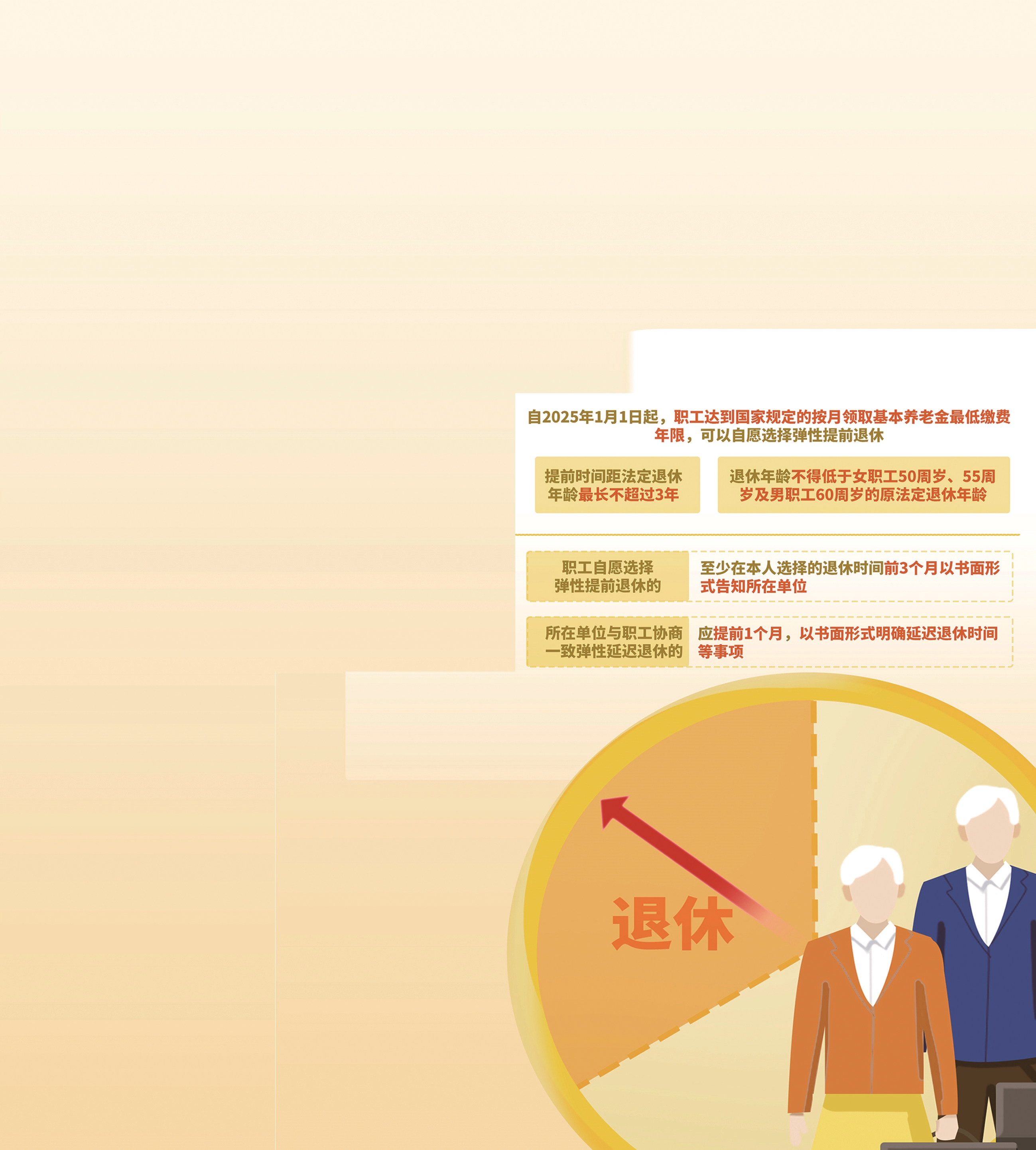 比如1975年12月出生的、原法定退休年龄为50周岁的女职工,改革后的法定退休年龄为50周岁6个月,对应的退休时间为2026年6月。如果她还是想50周岁退休,也就是2025年12月退休,那么最晚要在2025年9月向单位提交书面申请,这样便于用人单位作出安排,同时体现职工弹性提前退休的真实意愿。