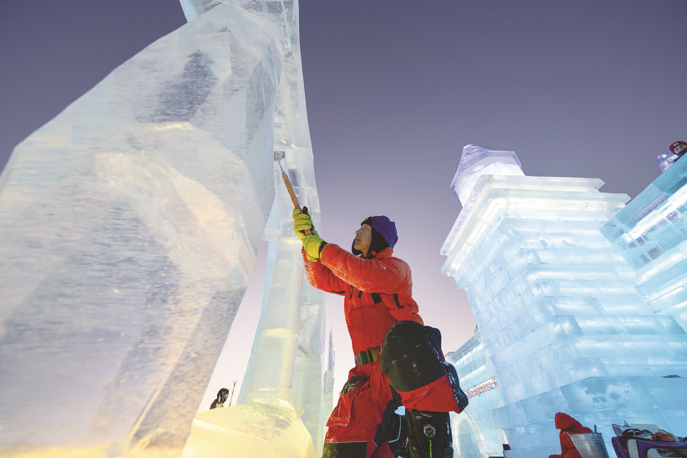 昨日,参赛选手在冰雪大世界园区内进行冰雕创作。当日,在哈尔滨冰雪大世界进行的第36届哈尔滨国际冰雕比赛进入第二天的赛程,来自厄瓜多尔、法国、韩国、中国、俄罗斯、西班牙、美国等12个国家的30支代表队的60位选手同场竞技,切磋冰雕技艺。 新华社照片