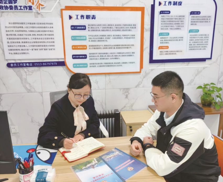 政协委员王靓在“助企圆梦”委员工作室接受咨询。 崇川区政协供图