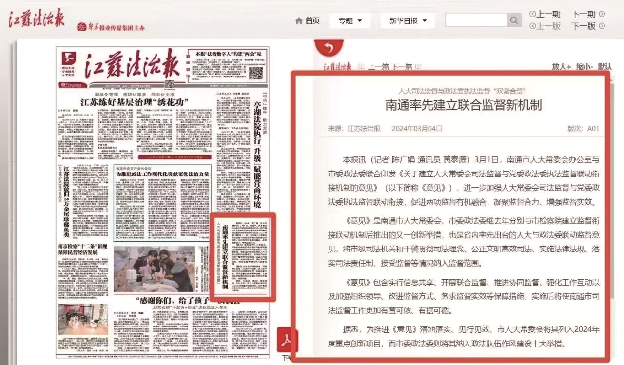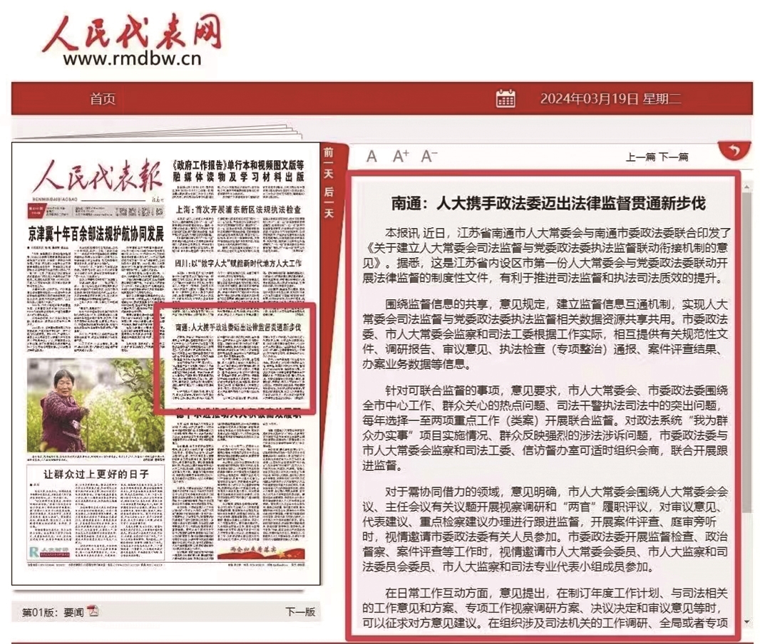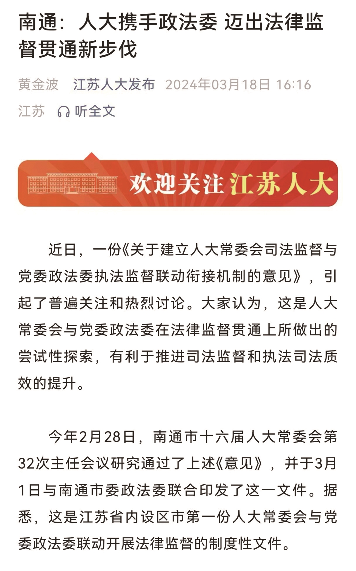 今年2月28日,南通市十六届人大常委会第32次主任会议研究通过了上述《意见》,并于3月1日与南通市委政法委联合印发了这一文件。据悉,这是江苏省内设区市第一份人大常委会与党委政法委联动开展法律监督的制度性文件。