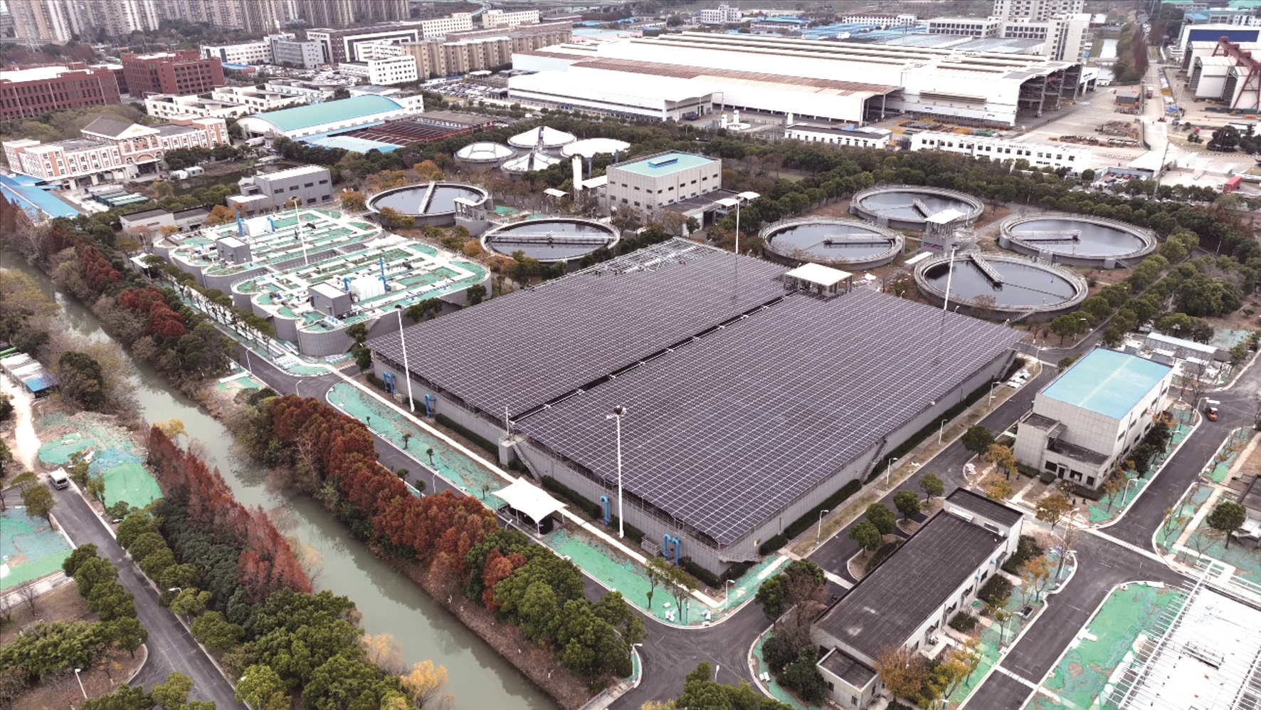 该项目充分利用厂房屋顶、生化池、深度处理深床反硝化滤池和高效池等构筑物,建设屋面分布式光伏电站,面积约73500平方米,共安装光伏组件11901块。根据预测,年发电量约700万度,除满足企业部分生产系统的电力需求外,多余电量将接入电网。预计每年可节约煤1946吨、减少二氧化碳排放5333吨,进一步助力集团向“绿”而行。