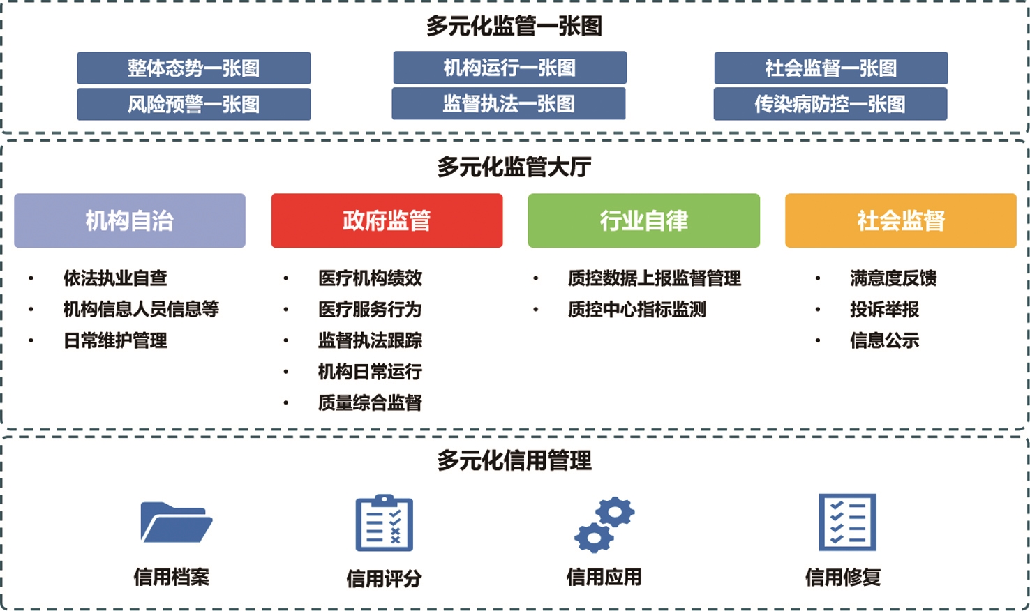 即时数据一体化。平台实现全市22家二级及以上医疗机构实时数据对接,整合门急诊、住院、出院、手术、检验检查、发热门诊等多个指标实时数据,真实直观地反映南通市医疗机构运行状态。监管数据一体化。从医疗机构绩效考核、医疗服务行为、监督执法跟踪、质量综合管理和机构日常运行五大方面搭建多元化监管大厅,横向融合、纵向贯通。实现智能预警分析追踪,直观研判医疗机构监管状态,对医疗机构潜在风险提前介入,事先干预,减少隐患。评价标准一体化。通过构建统一、规范的评分模型,建立健全各类机构信用评价体系,对医疗卫生机构、行业从业人员的行业规范化服务和信誉进行长期跟踪,形成各级医疗卫生机构“信用档案”。目前,已整合建立全市3499家医疗机构 “一户一档”,24639名医生、25206名护士 “一人一档”。