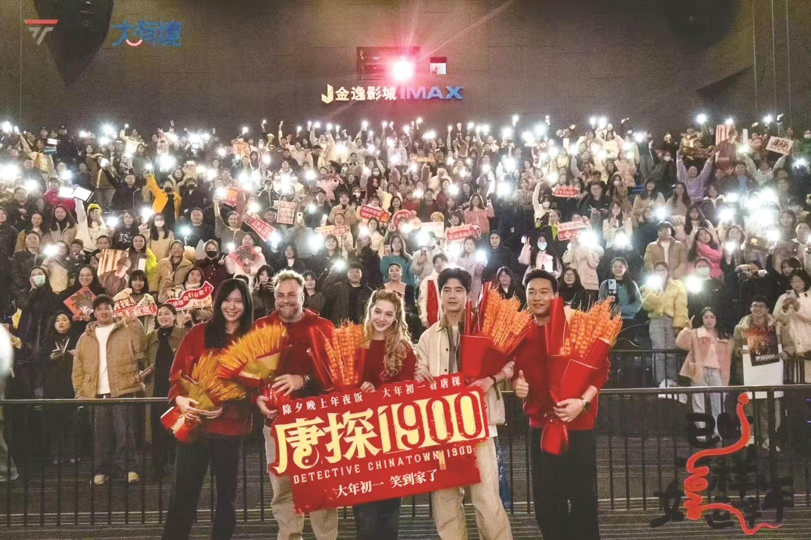 正月初五,刘昊然空降崇川大有境,《唐探1900》主创团队与市民亲密互动,现场气氛热烈。