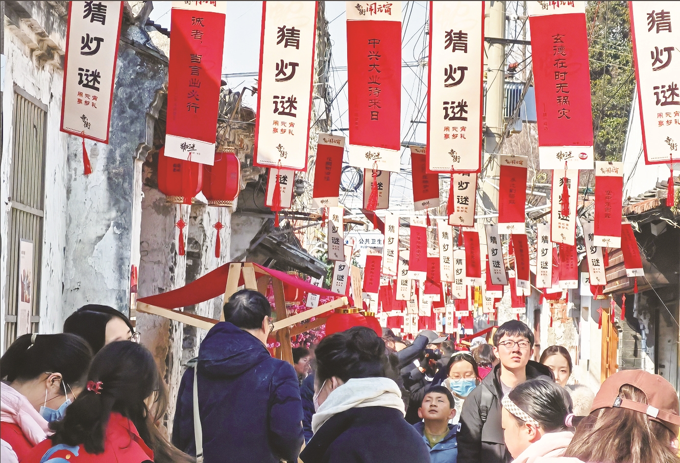 “身不归己(打一三字法律名字)”“年年无事故(打一古都名)”……为了充分体现元宵氛围,当天,100个火红的灯笼将寺街装扮得喜气洋洋,沿途悬挂的240条灯谜迎风飘扬(上图,李斌摄),还安排了志愿者给猜对者兑换小奖品。穿梭于灯笼和彩纸谜语间,大家或驻足凝思,或小声讨论,气氛热烈而欢乐。“叔叔,我猜到‘年年无事故’的谜底了,是长安。”郭里园小学的五年级小朋友秦穆彦兴高采烈地前往兑奖处兑换心仪的奖品。