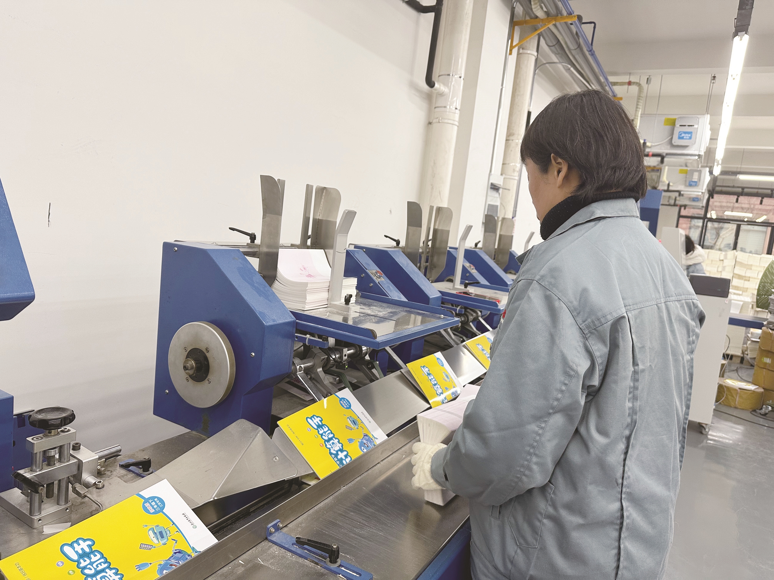 印刷车间内,去年引进的集中供墨、集中供气系统提高了印刷效率,印刷机高速运转,一张张印张新鲜出炉;装订车间内,两条高速胶装联动线有序生产,一沓沓折页好的印张经过加贴、加封面、胶装等流程,变成毛本,经裁切机裁切后,一本本崭新的书本完成了,工人们正在争分夺秒地加紧打包装车。