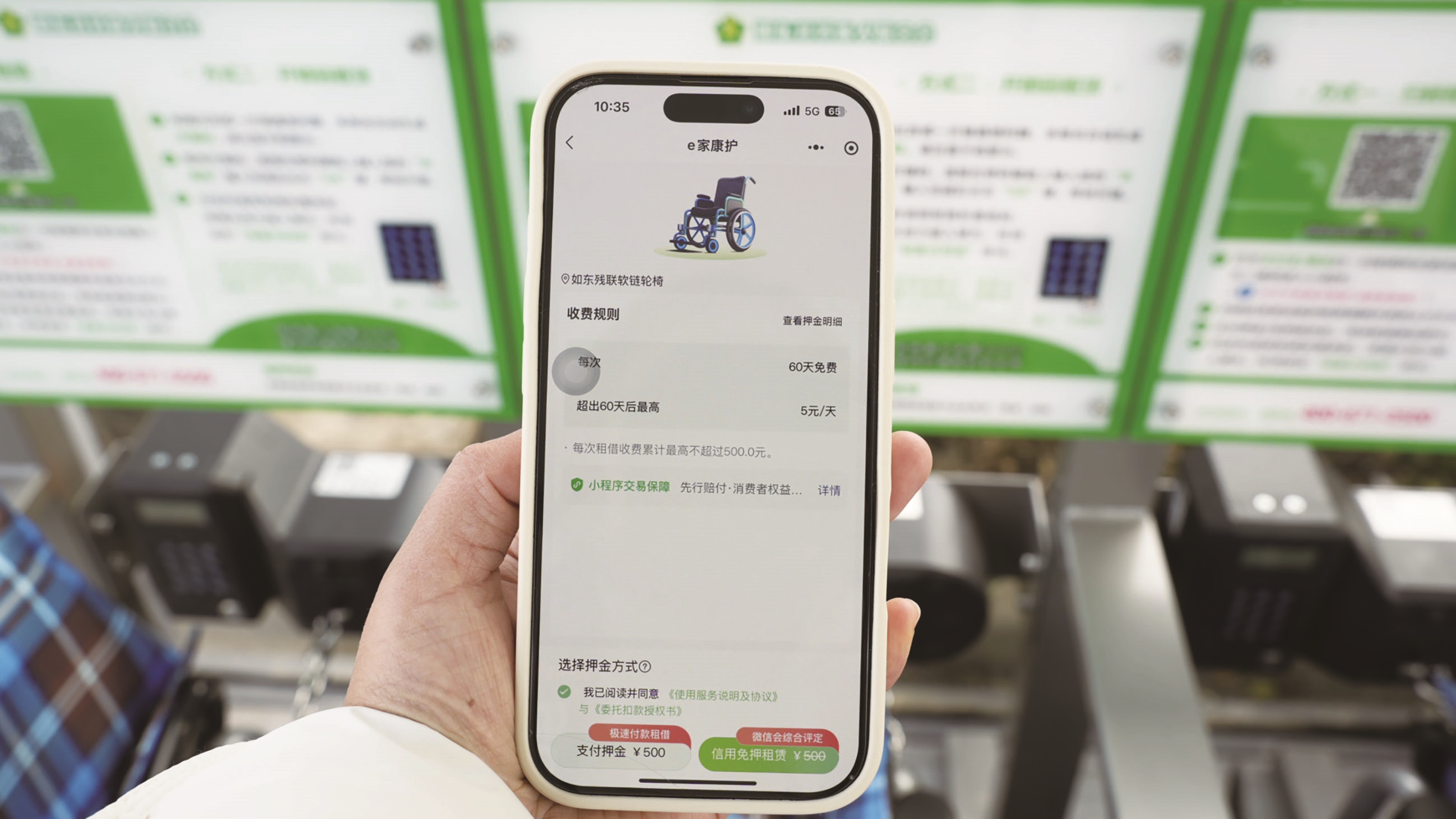 21日,如东县政务中心门卫室旁,一座明亮的玻璃小屋内,张女士正在归还租借了三天的轮椅。“上周,我母亲脚崴了,在家活动不方便,想到之前来办事看到这里有共享辅具,我就来借了三天,手机扫码很方便,而且完全免费。”