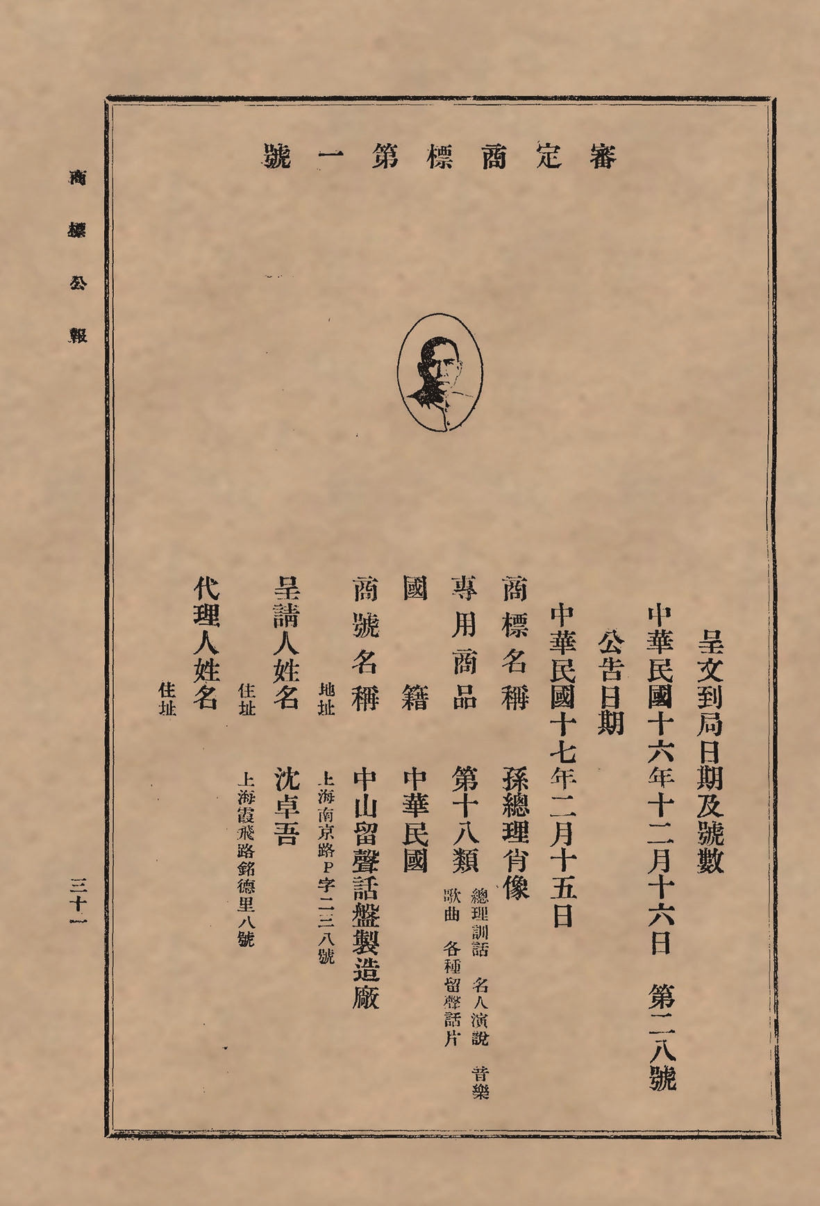 上图左起:红框内为民国版《孙中山先生建国方略图》中的吕四港;1929年南通民教馆所设中山馆征求革命著作及纪念品启事;1928年,沈卓吾申请的“孙总理肖像”获批为审定商标第一号;沈卓吾像(1926年);沙淦主编、孙中山题签的《社会世界》杂志。