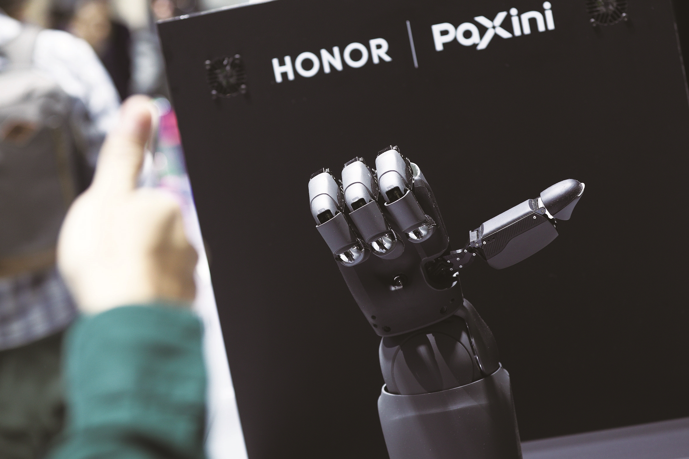 3月3日,在西班牙巴塞罗那举行的2025年世界移动通信大会上,参观者与多维触觉灵巧手互动。