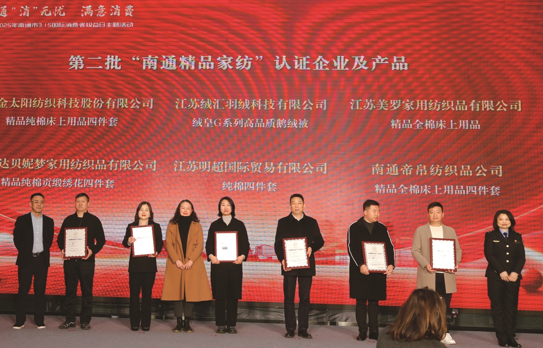 3月15日,在“通‘消’无忧 满意消费”2025年南通市3·15国际消费者权益日主题活动中,江苏绒汇羽绒科技有限公司的“绒皇G系列高品质羽绒被”产品通过认证,获颁“南通精品家纺”称号。