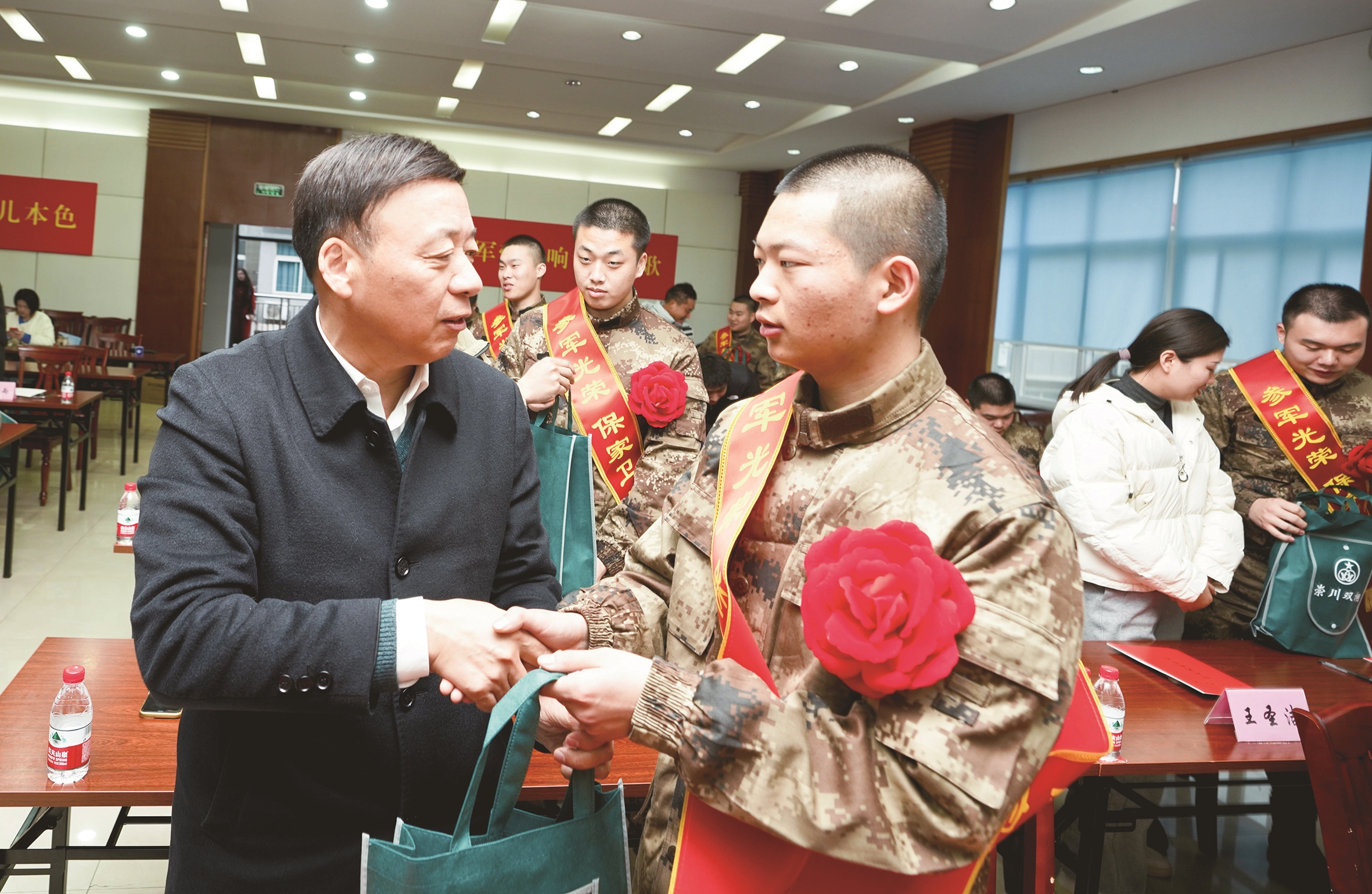 昨天下午,退役老兵与新兵亲切交谈。当日,崇川区举行“新兵守国 老兵守家”结对暨家庭医生签约仪式,17名优秀退役军人分别与即将启程的进藏新兵结对,做好后方家庭服务工作,助力战士安心服役。 赵国庆摄