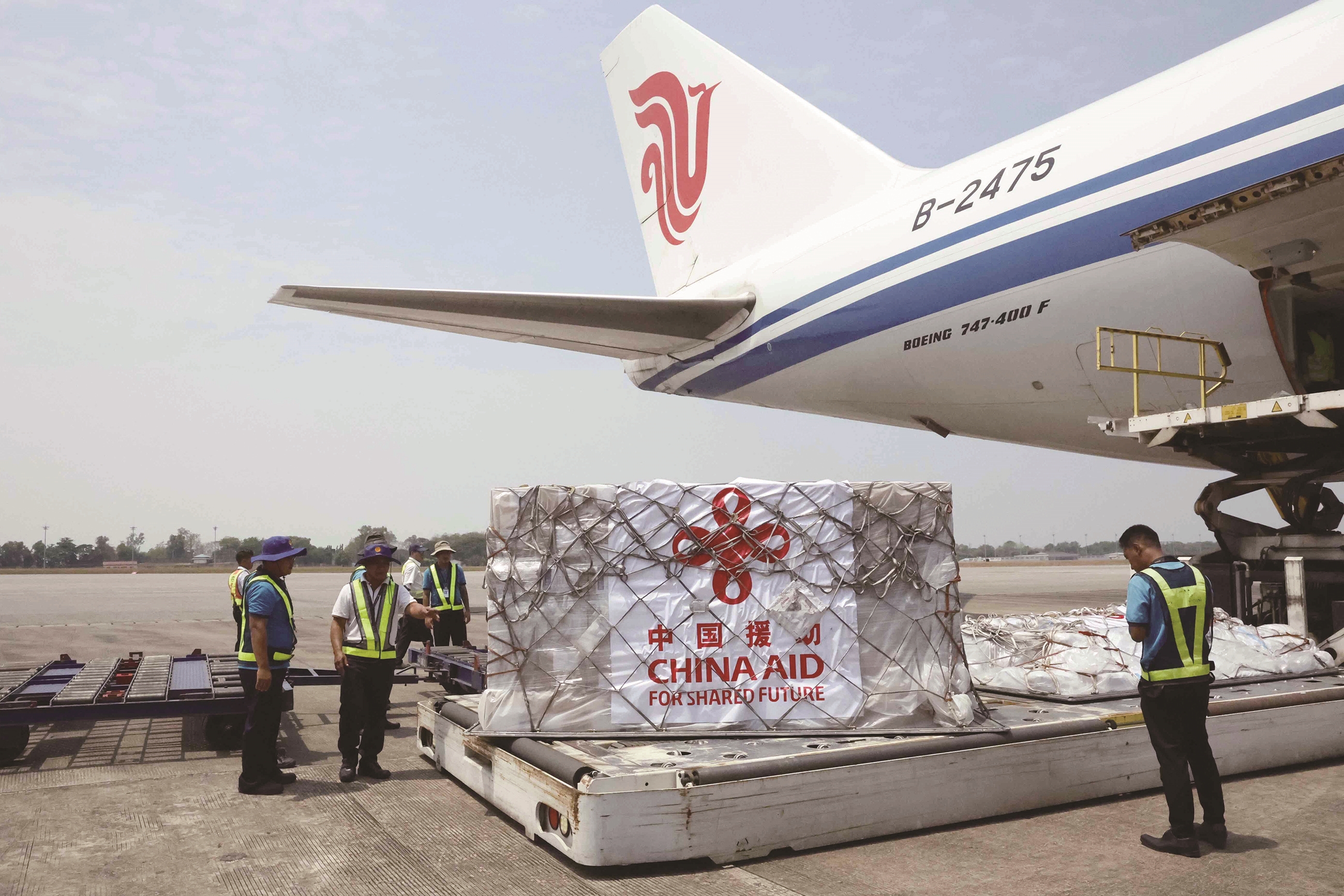 4月5日,中国政府向缅甸提供的第三批紧急人道主义地震救灾援助物资抵达缅甸仰光国际机场。据了解,第三批援助物资包括1048个净水设备、1万顶蚊帐、1.5万个急救包和400顶帐篷。 新华社照片