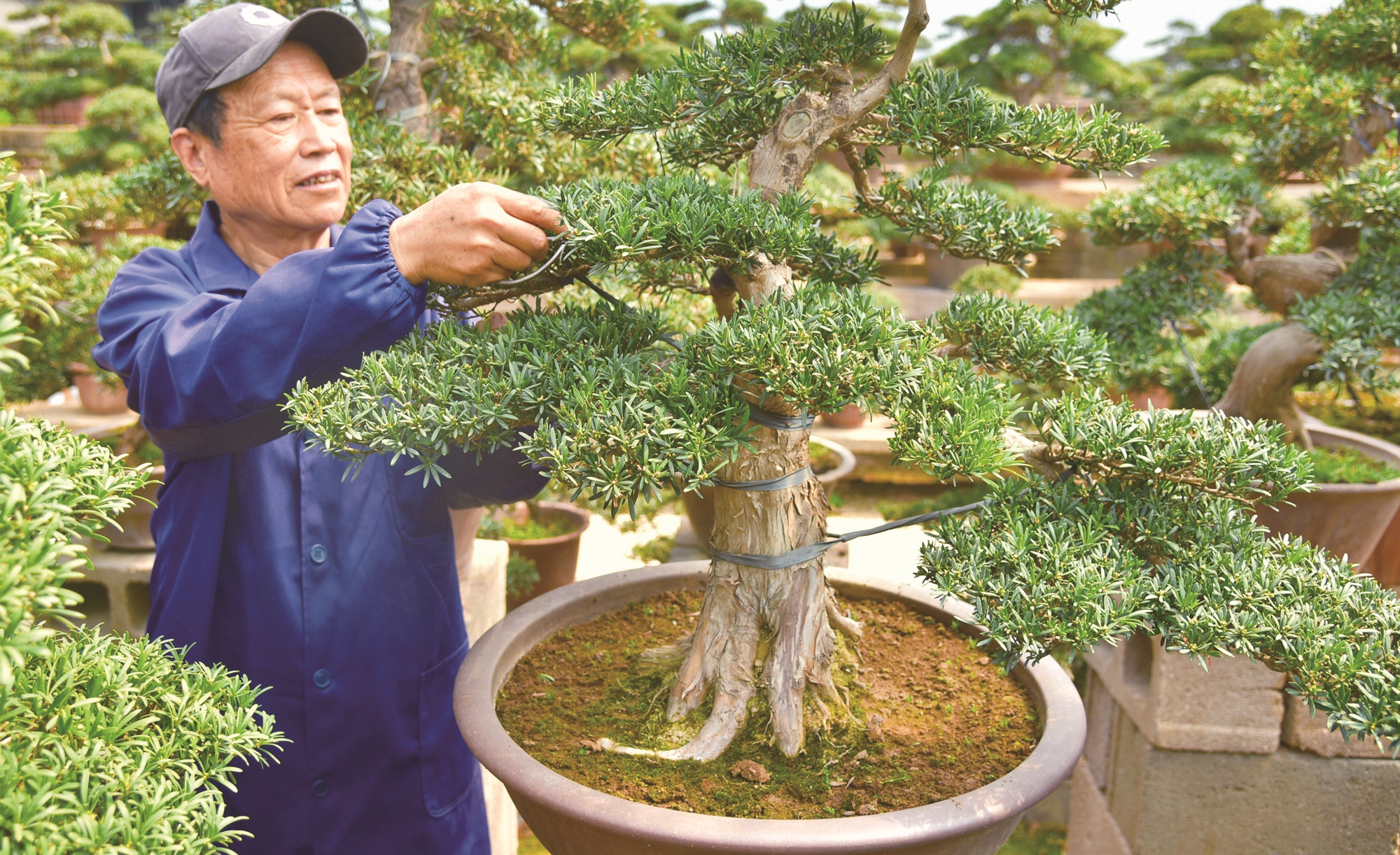 昨日,花农在如皋市磨头镇培育基地修整花木盆景。眼下正是花木生长管理的关键期,处处可见花农忙碌的身影。吴树建 纪志远摄