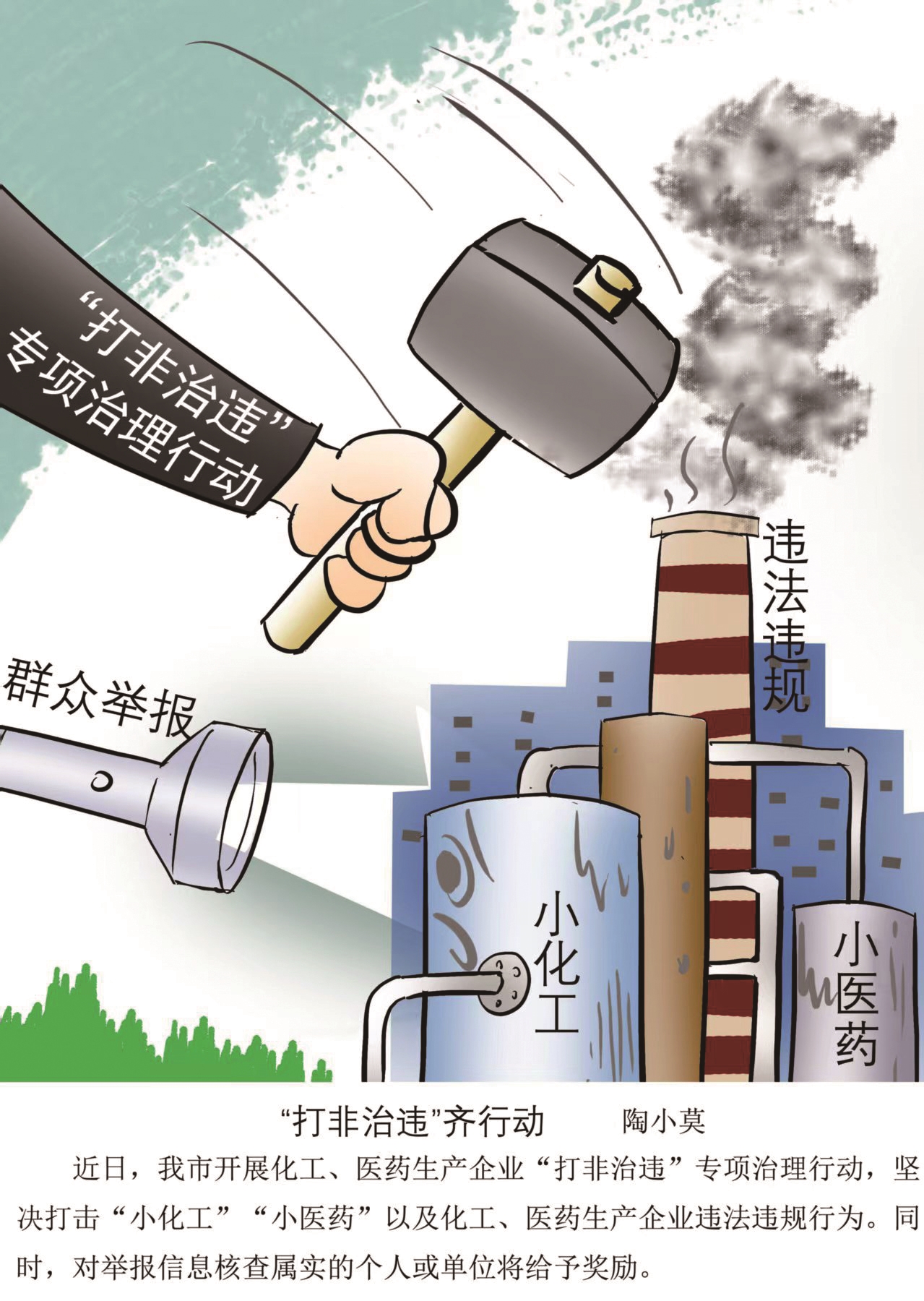 近日,我市开展化工、医药生产企业“打非治违”专项治理行动,坚决打击“小化工”“小医药”以及化工、医药生产企业违法违规行为。同时,对举报信息核查属实的个人或单位将给予奖励。 陶小莫画