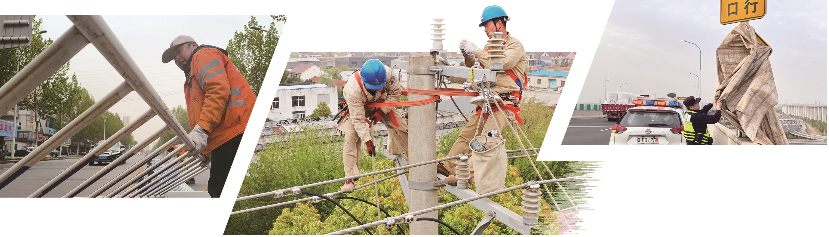 ▲工人在钟秀西路扶正被大风吹倒的隔离护栏。 记者 许丛军摄 ▲交警清理遮挡高速公路指示标牌的飘散物。 薛逸飞摄 ?受大风天气影响,如东县内10千伏港湾线8台配电变压器断电,国网如东县供电公司第一时间组织人员抢修。国网南通供电公司提供