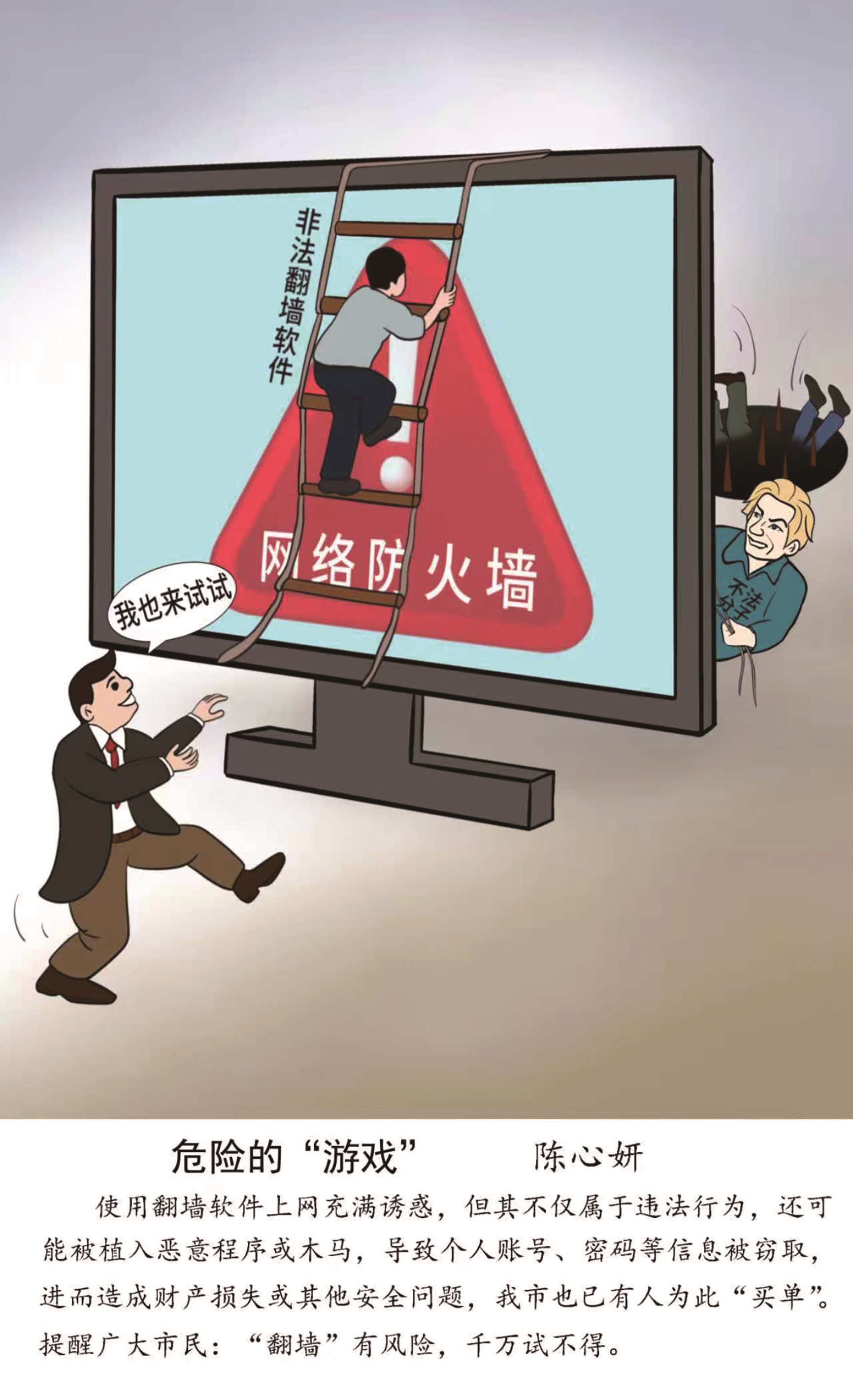 使用翻墙软件上网充满诱惑,但行为违法。这类软件可能被植入恶意程序或木马,导致个人账号、密码等信息被窃取,进而造成财产损失或其他安全问题。在此提醒广大市民,“翻墙”有风险,千万试不得。