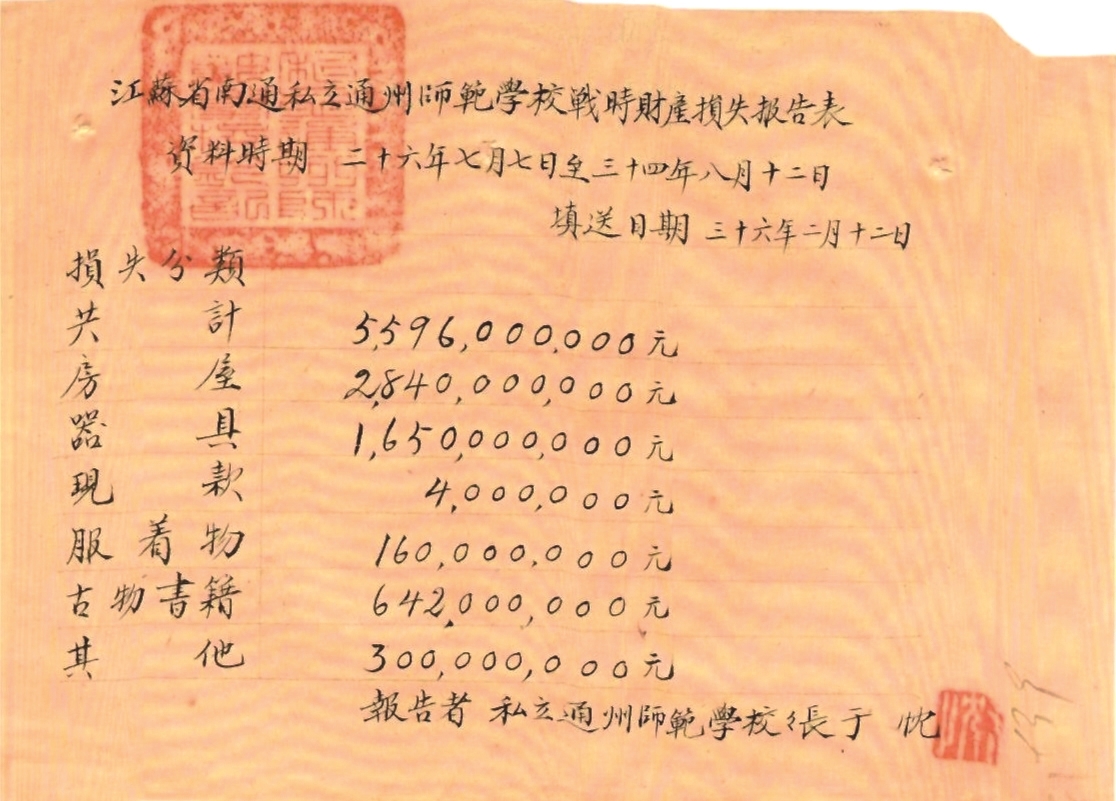 根据1947年3月30日民国南通县政府县长王亚武致江苏省政府、江苏省教育厅的《关于私立通州师范重报战时损失表及战前校舍图战后照片》呈文记载,民国三十四年(1945)冬,实业家、教育家张季直(张謇)创立的教养事业委员会时任主任张敬礼将抗战期间通州师范遭受的损失情况以及坚持教育的经过呈报民国江苏省政府。1946年,民国政府还都南京后,又按照《战时财产直接损失报告表》所列项目及时值估计进行了重新统计,并附上有关照片资料。