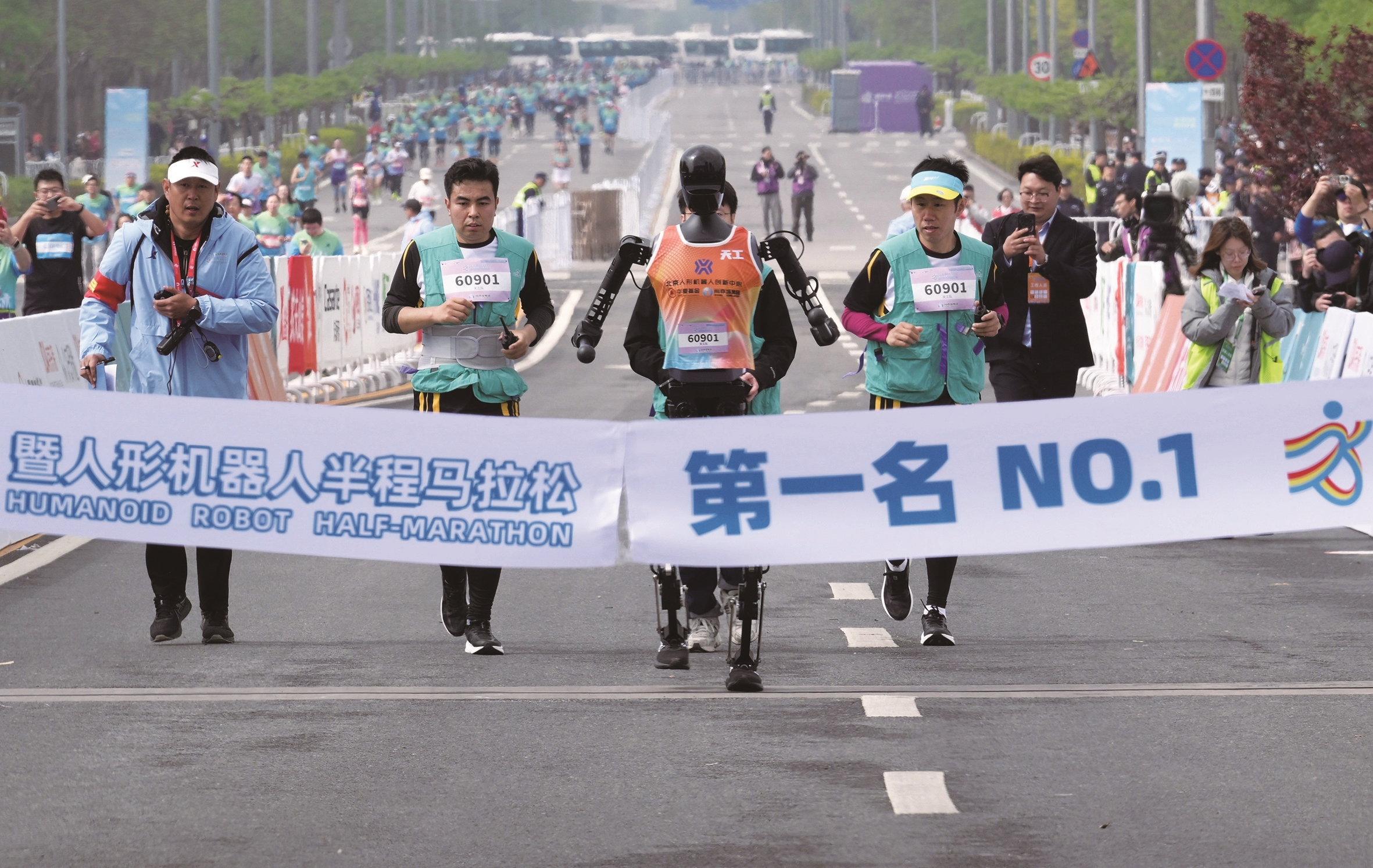 昨天,天工队选手天工Ultra(左三)在比赛中冲向终点。当日,2025北京亦庄半程马拉松暨人形机器人半程马拉松在北京亦庄举行。