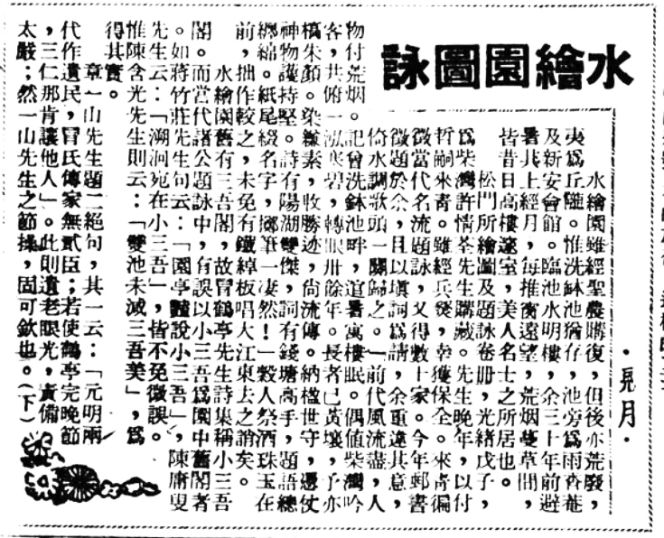 另有钱基博看重的孙星衍诗作,《翰墨丹青水绘园》未录,不过有迹可循。1944年5月,沪上《海报》连载《〈水绘园图〉咏》上下篇。作者署名“见月”。许来青寄来画面概述及手录众多名家题咏诗句,见月接受其邀,阅览诸作,写下一首《水调歌头》:前代风流尽,人物付荒烟。记曾洗钵池畔,逭暑寓楼眠。偶值柴湾吟客,共俯一泓寒碧,转眼卅余年。长者已黄壤,予亦槁朱颜。染缣素,收胜迹,尚流传。纳楹世守,凭仗神物护持坚。诗有阳湖双杰,词有钱塘高手,题语总缠绵。纸尾缀名字,掷笔一凄然。