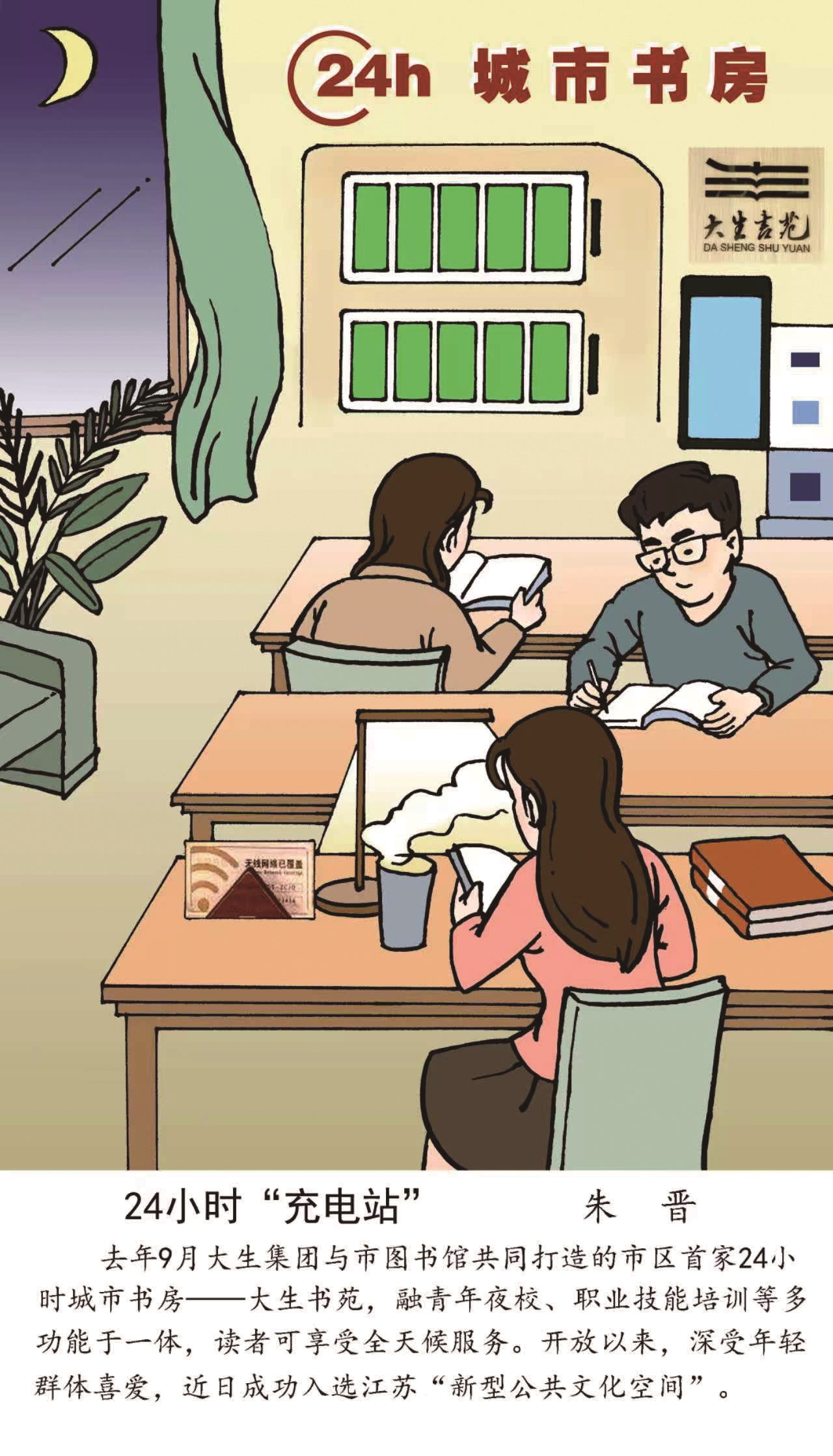 大生书苑近日成功入选江苏“新型公共文化空间”。该书苑由大生集团与市图书馆共同打造,是市区首家24小时城市书房,融青年夜校、职业技能培训等多功能于一体,读者可享受全天候服务。 朱晋画
