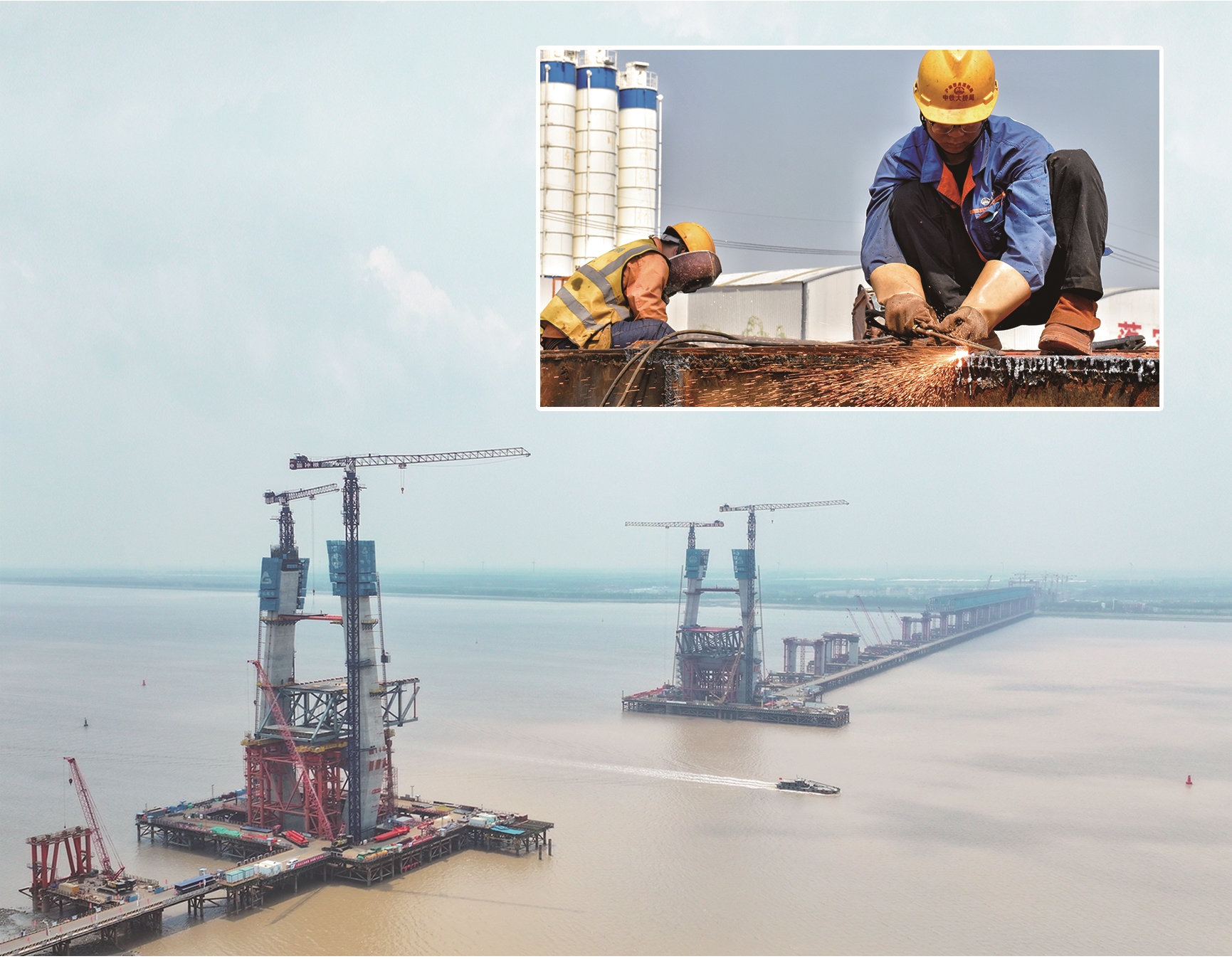 今年“五一”假期,对于坚守一线的500余名大桥建设者来说尤为重要。目前,崇启公铁长江大桥引桥侧正加紧进行公路移动模架拼装,主塔也已突破100米,即将迎来上塔柱及上横梁施工阶段,为了确保在5月底4号主塔顺利“握手”,大家正铆足干劲,斗志昂扬。