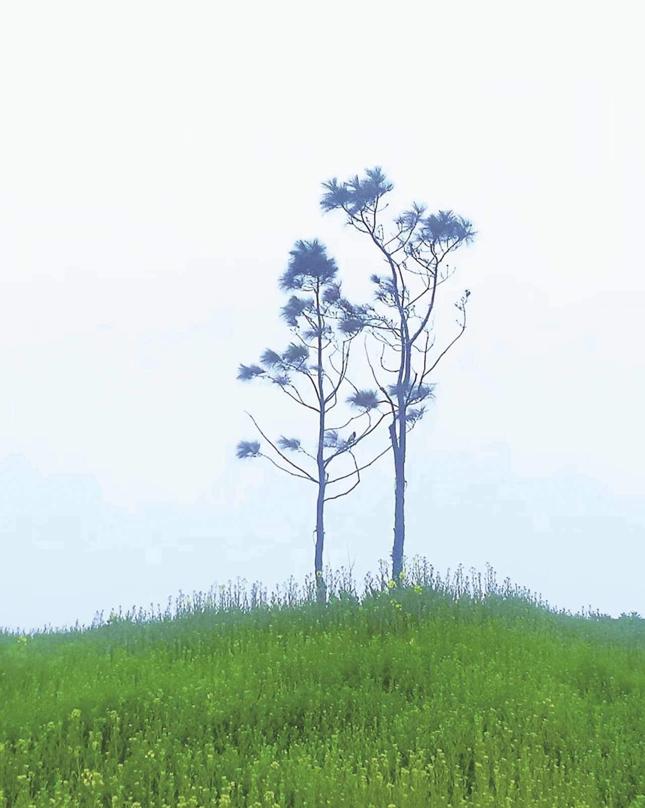 我独自乘车去往未知的远方。倚窗而坐,人看起来很安静,心却为窗外如画的风景暗自翻涌。连绵的山,屏风似的山,离得那么近,起伏的山丘铺满绿茵,上面缀有黑的牛、白的羊,它们有的悠然慢走,有的呆立不动。那些白羊啊,白得就像从天上落下来的云团。而那些黑牛呢,简直黑得像乡下的灶台大锅底。小时候看见奶奶每过一段时间,就要把家里两口大锅从灶台上端出来,拎到屋后桥头,哐哐哐地铲掉一层草木灰。近前,一棵接着一棵开满水色春花的古树,恍恍惚惚地擦窗闪过,不断闪过。