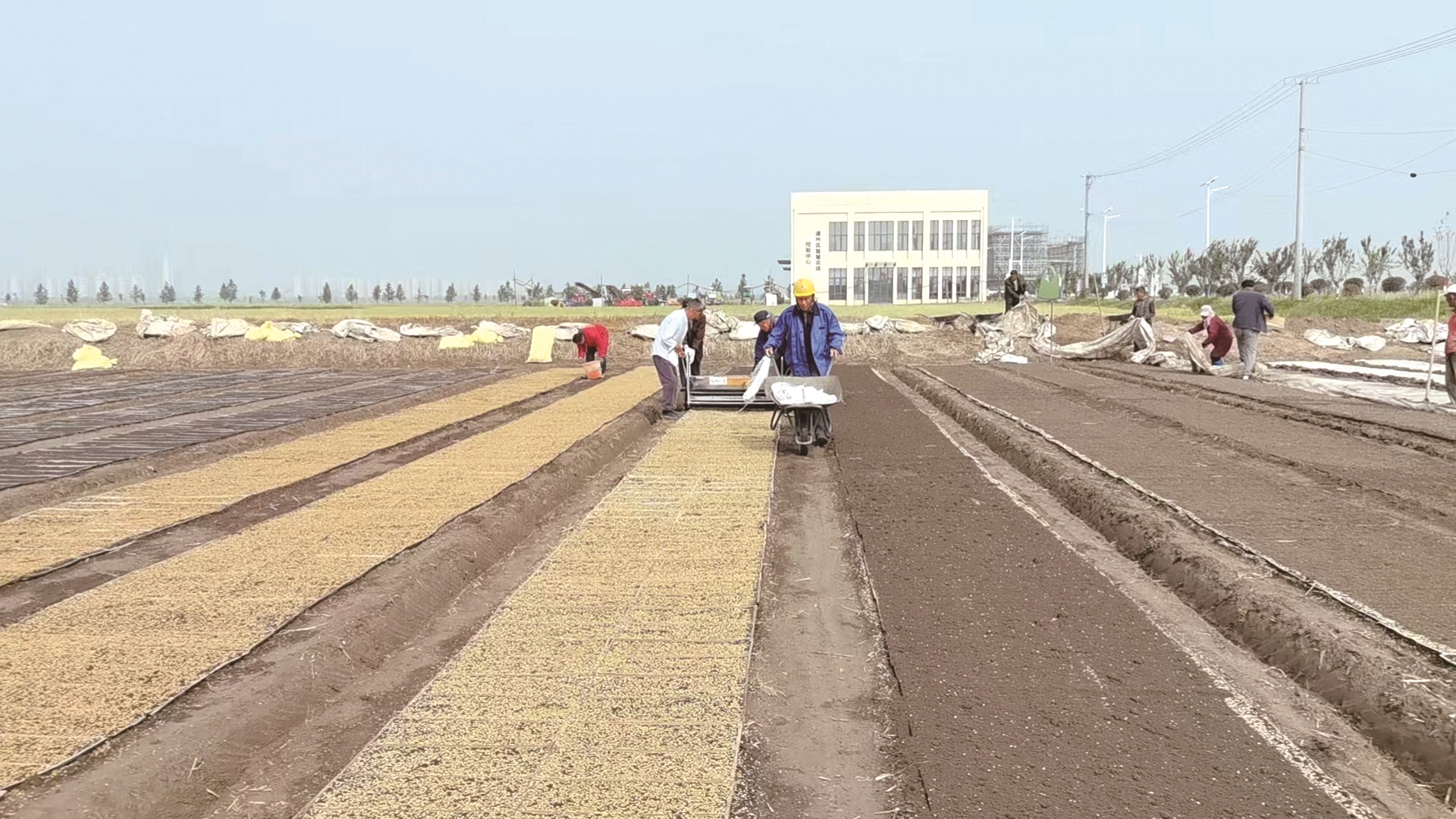 据悉,今年金沙基地的万亩粮田水稻种植面积3921亩,为确保移栽时的秧苗品质,采用分批培育的方式,分为六批进行,每批间隔三天,目前第二批水稻种子播撒工作正在有序进行中。